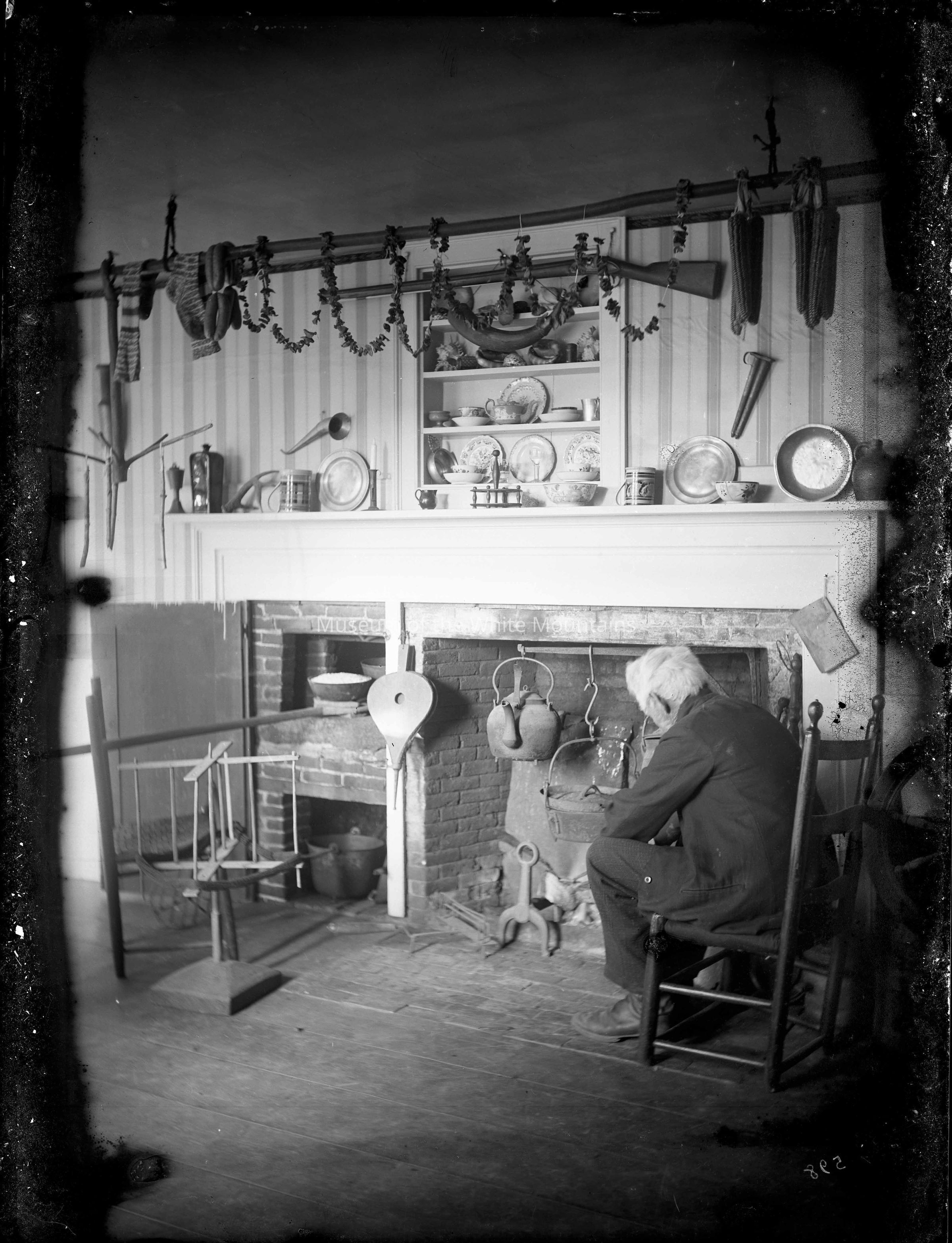 Interior kitchen scene with a white-haired man sitting in a wooden chair by a hearth with his back to the viewer. There is a gun over the mantelpiece and corn, sausages, and stockings hung from the ceiling. Many objects decorate the mantel and the hearth. This negative was later used to create the print titled "Meditation", Object ID MWM2010.0001.1927, and a postcard of the same name, Object ID MWM2010.0001.0354.