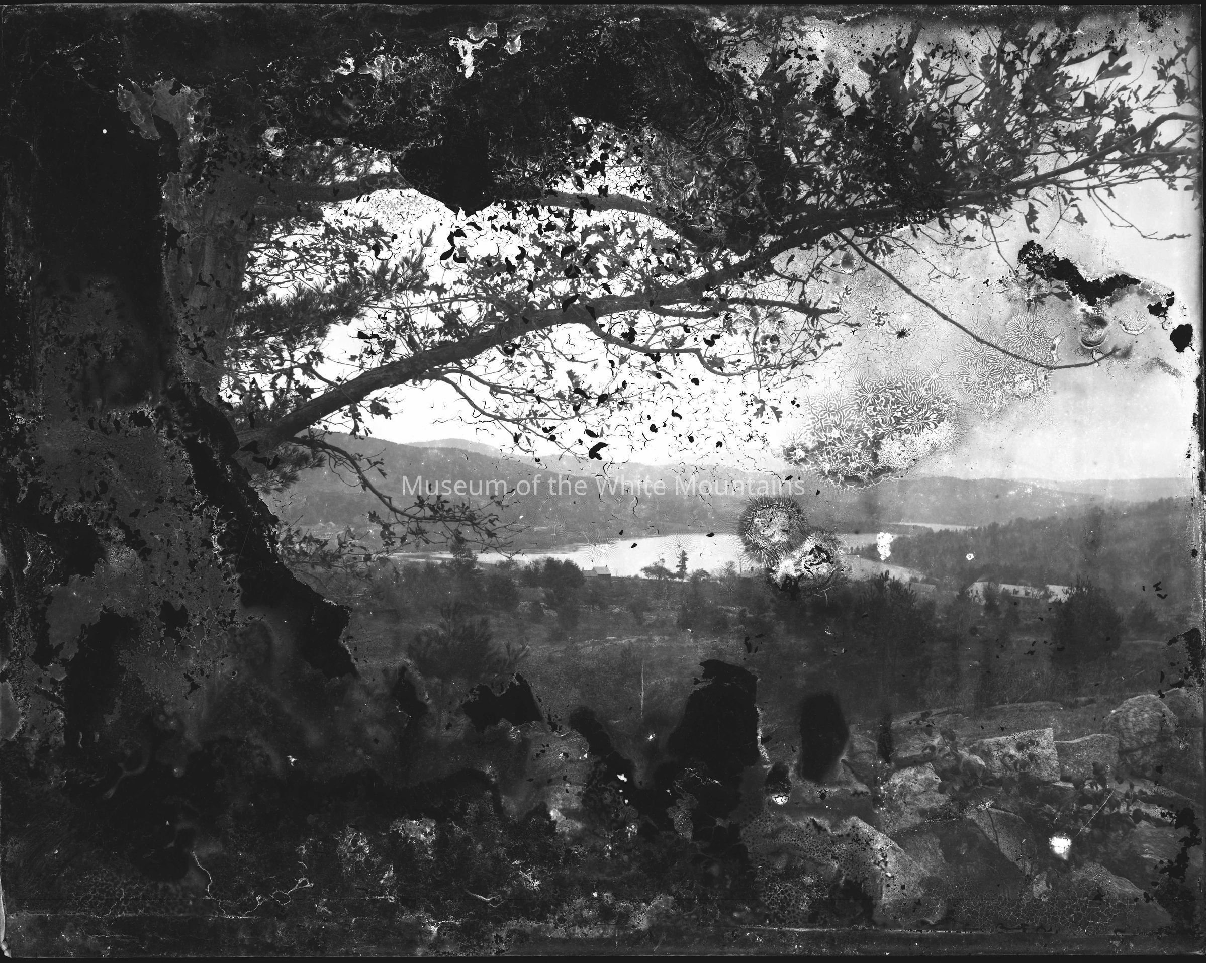 Glass is in good condition. Emulsion, however, is flaking far into the sides of the plate and a good portion of the image of the large tree in the foreground has flaked away. Part of the lake in the center of the image has flaked away as well. Image was mostly indiscernable until scanned, which is not the case with glass plate negatives in good or excellent condition.