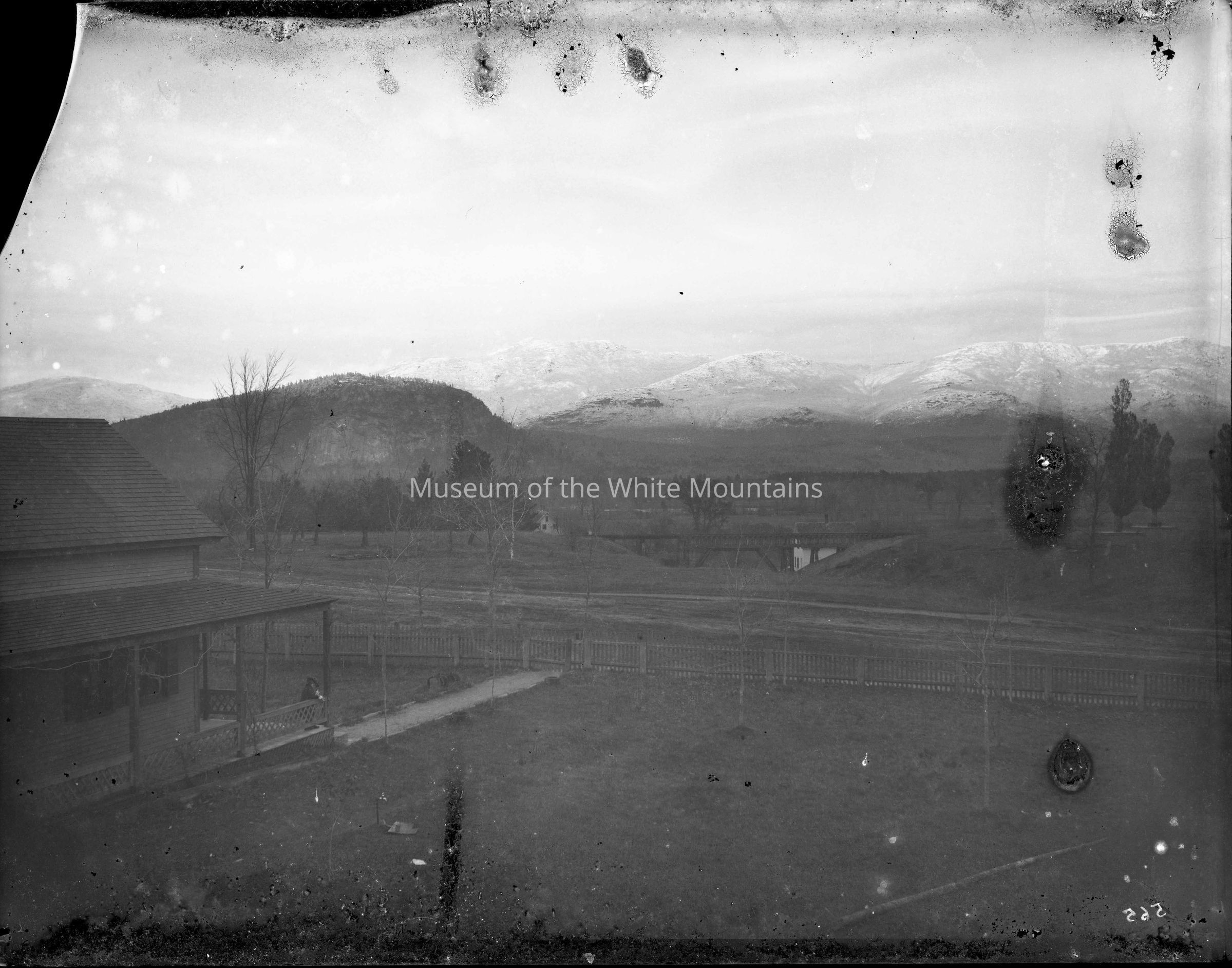On the left side in the foreground is a house with a person leaning over the porch railing. To the right of the house in the yard seems to be a water spigot. There are a few bare trees in the yard and a length of tree trunk or branch on the ground toward the right hand side of the image. The middle ground is bisected by the fence for the house's property, which runs parallel to a dirt road. Beyond that a train trestle is visible, though its supports disappear into a gorge. It spans two hills, also fairly parallel with the road. There are more trees in the middle ground, both bare and evergreen. In the background to the left side is a hill, and spanning the image are numerous snow-capped mountains.Collection