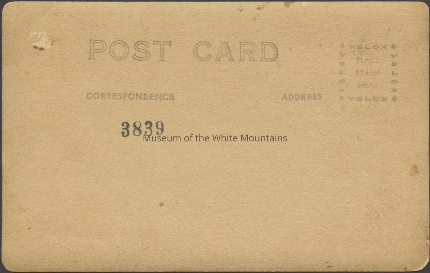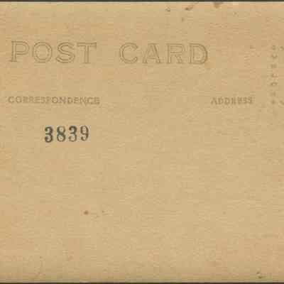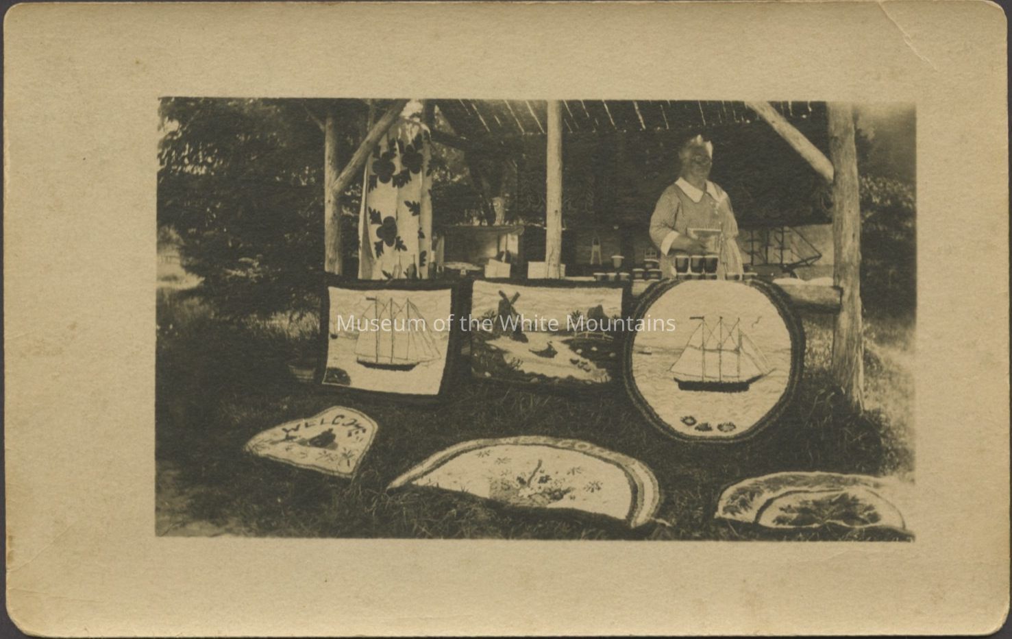 Sepia toned image of a woman standing in a booth with decorative rugs or tapestries. Several jars are stacked on the counter. Back Description: Typical postcard back.