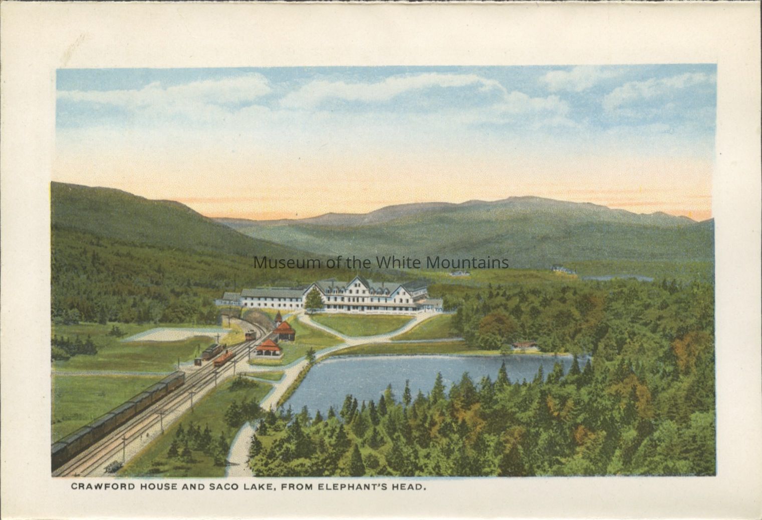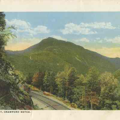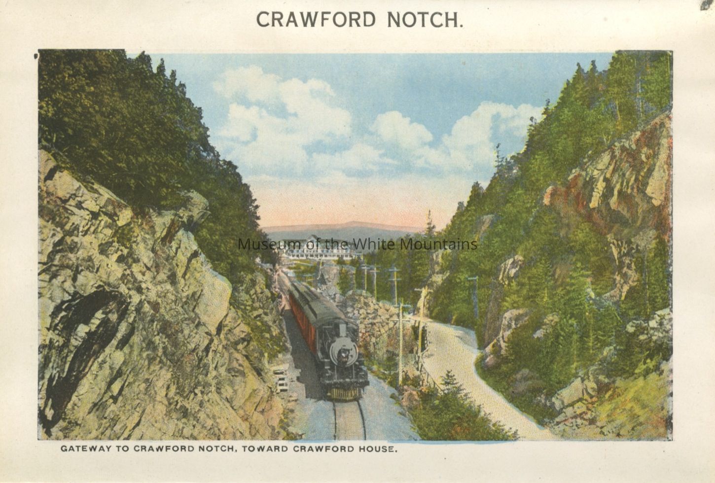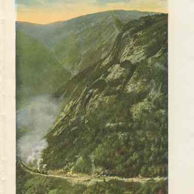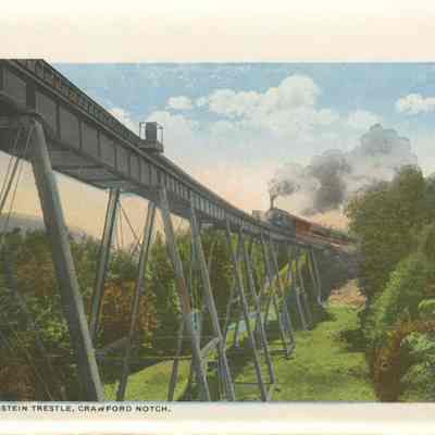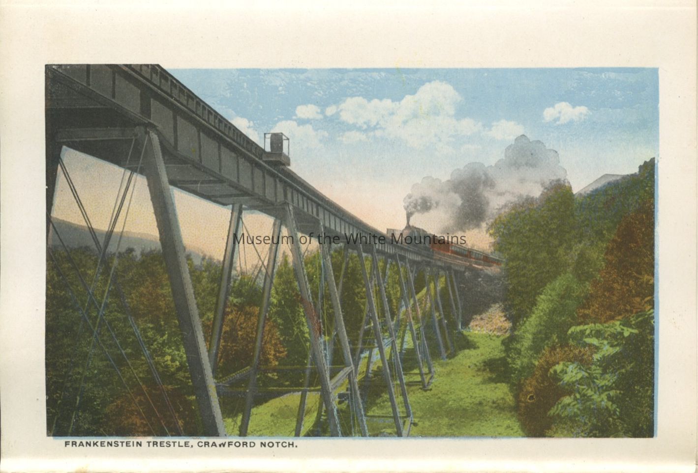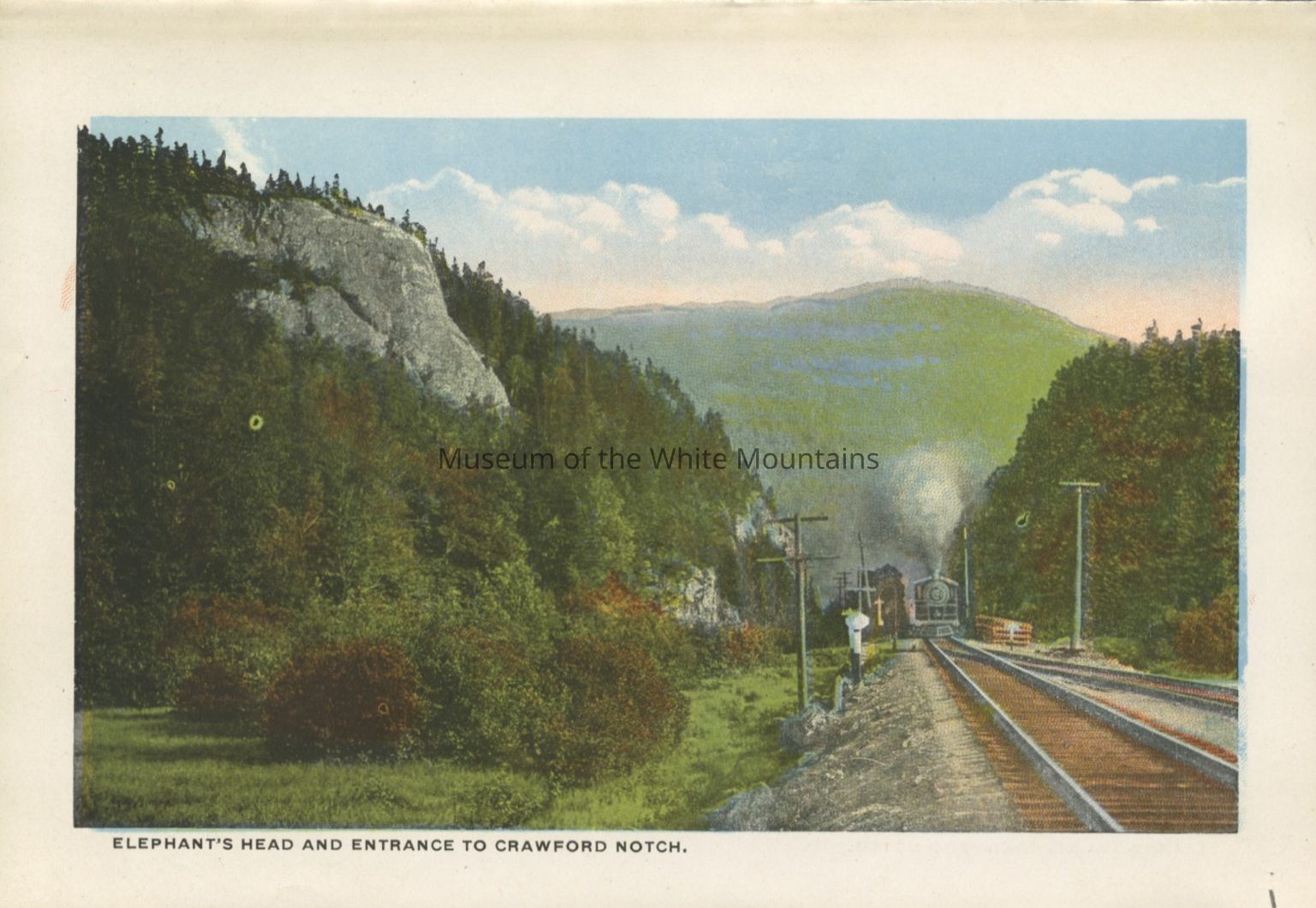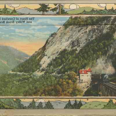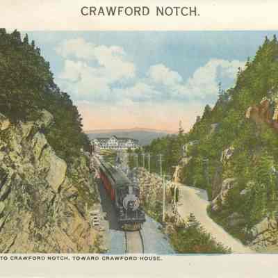 Beecher Cascade (Grafton county, New Hampshire : stream), Crawford House (Coos county, New Hampshire : inhabited place), Crawford Notch (New Hampshire : valley), Elephant Head (Carroll county, New Hampshire : rock), Frankenstein Trestle (Coos county, New Hampshire : structure), Giants Stairs (Coos county, New Hampshire : rock), Gibbs Falls (Coos county, New Hampshire : waterfall), Willard, Mount (Carroll county, New Hampshire : peak), North Conway Scenic Railroad, Pearl Cascade (Grafton county, New Hampshire : waterfall), Saco Lake (Coos county, New Hampshire : lake), Silver Cascade (New Hampshire, United States : stream), Willey Brook Bridge (Carroll county, New Hampshire : structure), mountains, railroad tracks, trains, hotels, dirt roads, utility poles, notches, automobiles, people, Buildings, lakes, railroad platforms, paths, docks, bridges, trestles, donkeys, waterfalls, cascades,
