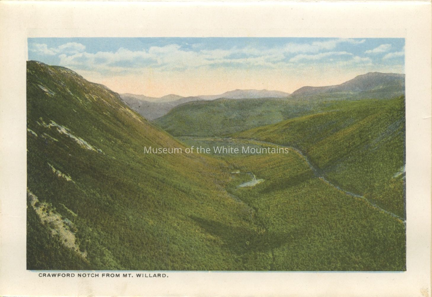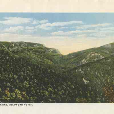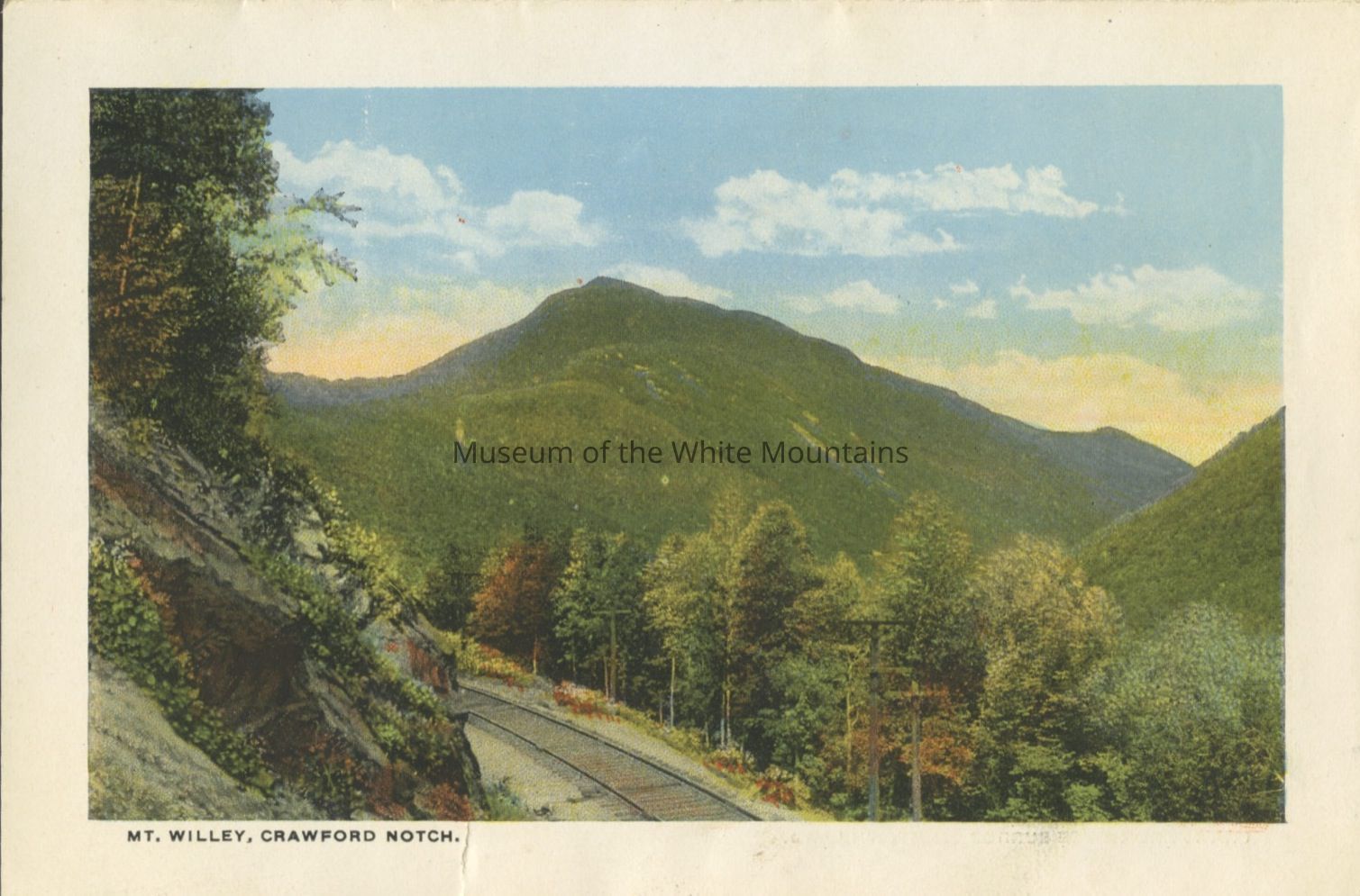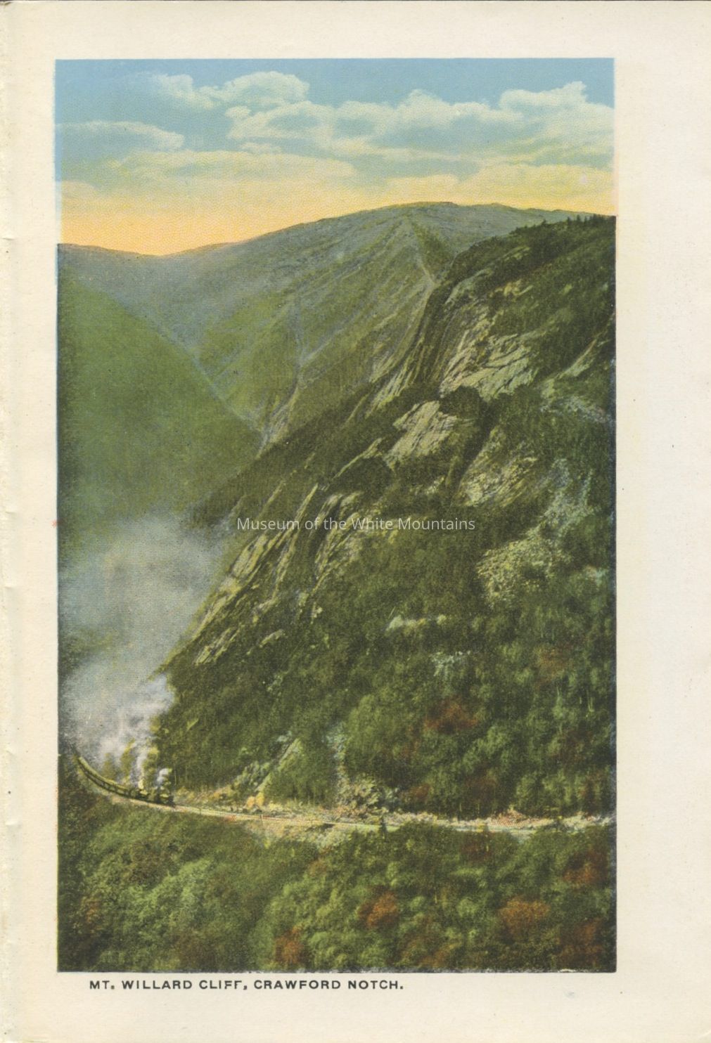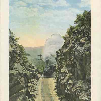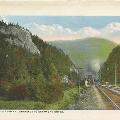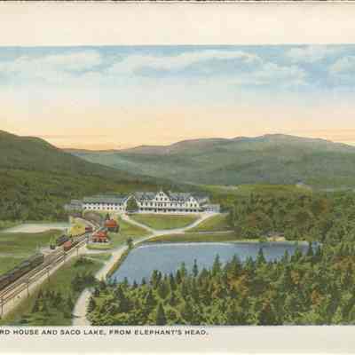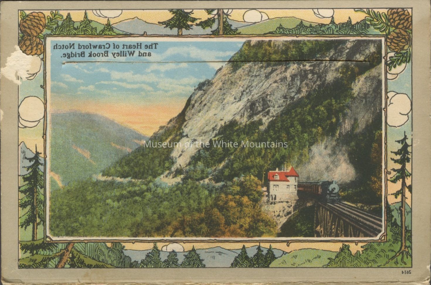 Beecher Cascade (Grafton county, New Hampshire : stream), Crawford House (Coos county, New Hampshire : inhabited place), Crawford Notch (New Hampshire : valley), Elephant Head (Carroll county, New Hampshire : rock), Frankenstein Trestle (Coos county, New Hampshire : structure), Giants Stairs (Coos county, New Hampshire : rock), Gibbs Falls (Coos county, New Hampshire : waterfall), Willard, Mount (Carroll county, New Hampshire : peak), North Conway Scenic Railroad, Pearl Cascade (Grafton county, New Hampshire : waterfall), Saco Lake (Coos county, New Hampshire : lake), Silver Cascade (New Hampshire, United States : stream), Willey Brook Bridge (Carroll county, New Hampshire : structure), mountains, railroad tracks, trains, hotels, dirt roads, utility poles, notches, automobiles, people, Buildings, lakes, railroad platforms, paths, docks, bridges, trestles, donkeys, waterfalls, cascades,