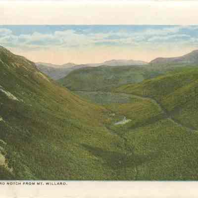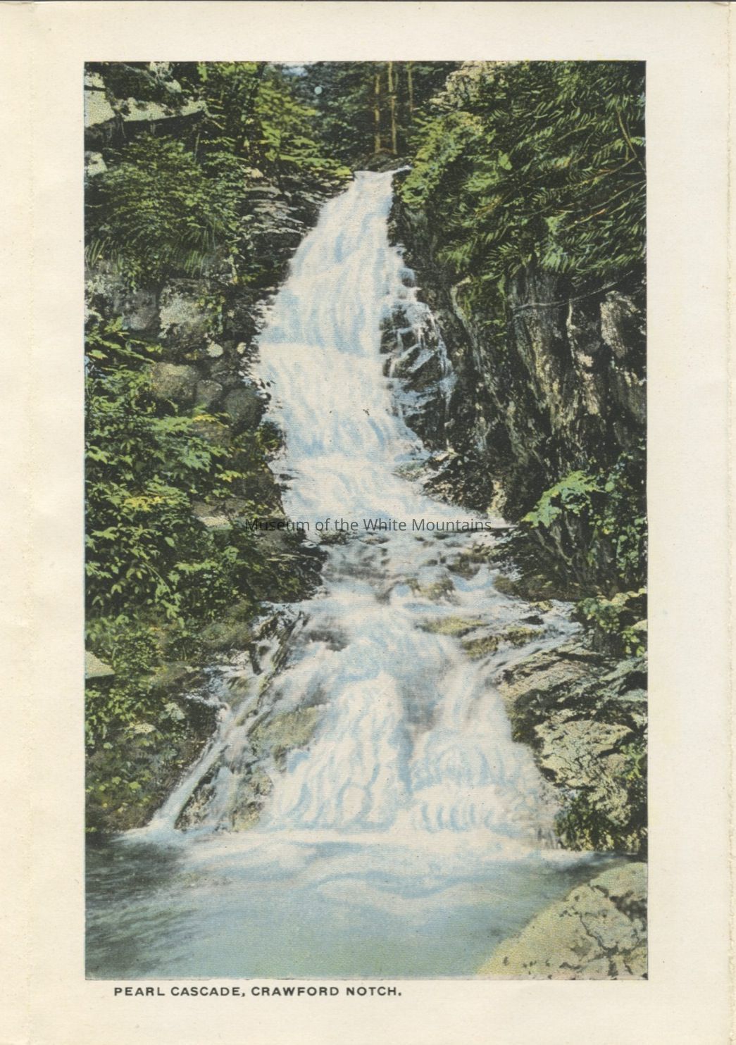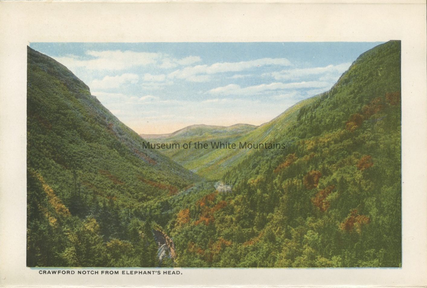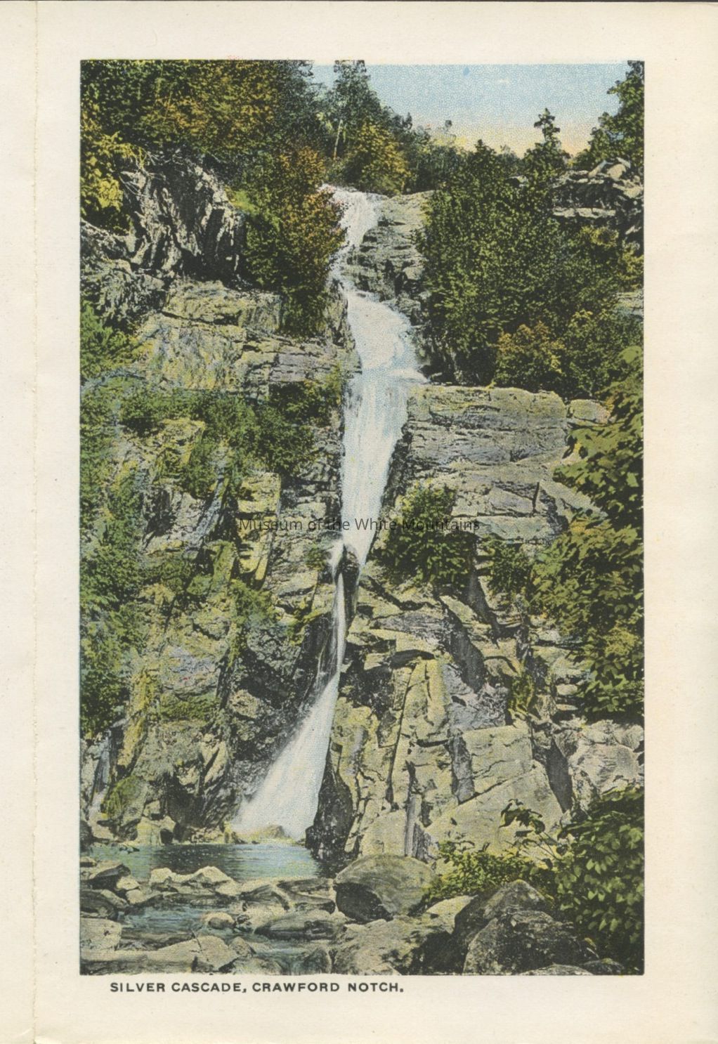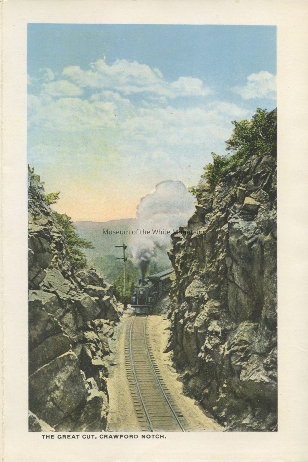 Beecher Cascade (Grafton county, New Hampshire : stream), Crawford House (Coos county, New Hampshire : inhabited place), Crawford Notch (New Hampshire : valley), Elephant Head (Carroll county, New Hampshire : rock), Frankenstein Trestle (Coos county, New Hampshire : structure), Giants Stairs (Coos county, New Hampshire : rock), Gibbs Falls (Coos county, New Hampshire : waterfall), Willard, Mount (Carroll county, New Hampshire : peak), North Conway Scenic Railroad, Pearl Cascade (Grafton county, New Hampshire : waterfall), Saco Lake (Coos county, New Hampshire : lake), Silver Cascade (New Hampshire, United States : stream), Willey Brook Bridge (Carroll county, New Hampshire : structure), mountains, railroad tracks, trains, hotels, dirt roads, utility poles, notches, automobiles, people, Buildings, lakes, railroad platforms, paths, docks, bridges, trestles, donkeys, waterfalls, cascades,