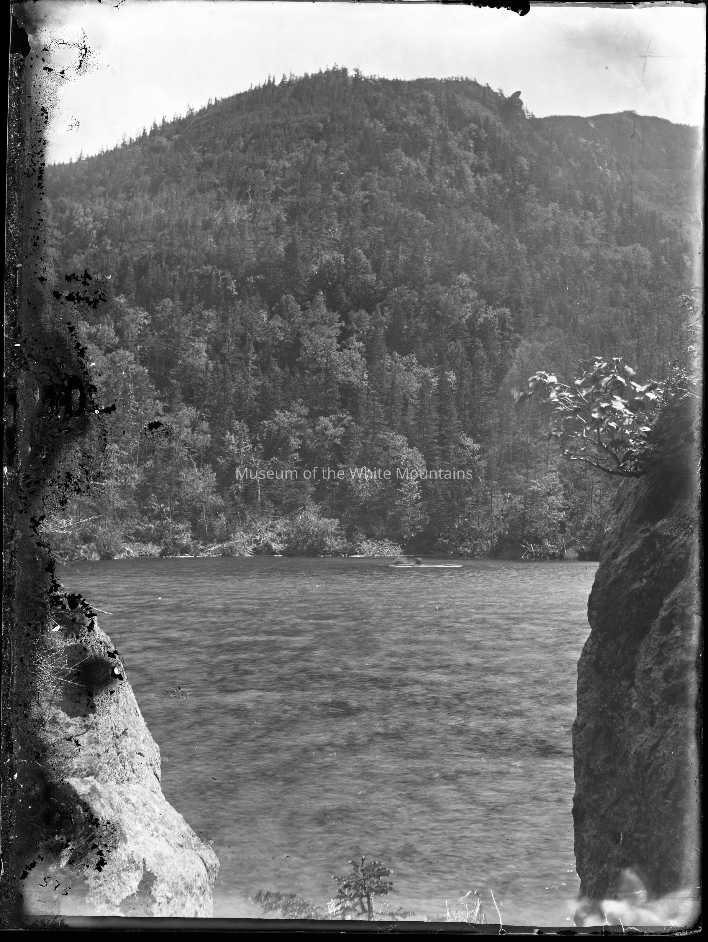 The emulsion is cracking and peeling away far into the left-hand side of the image, which obscures some of the boulder, the water, and the hill. There appears to be some scratching to the glass plate along the top and bottom of the image. Marked with the numbers "575" in the lower left-hand corner.