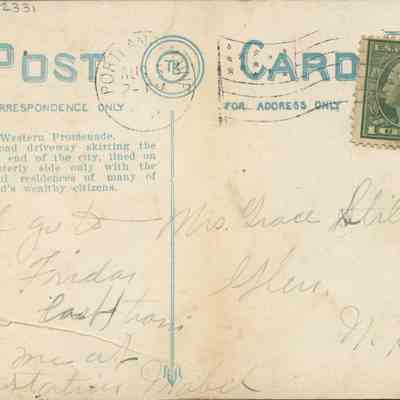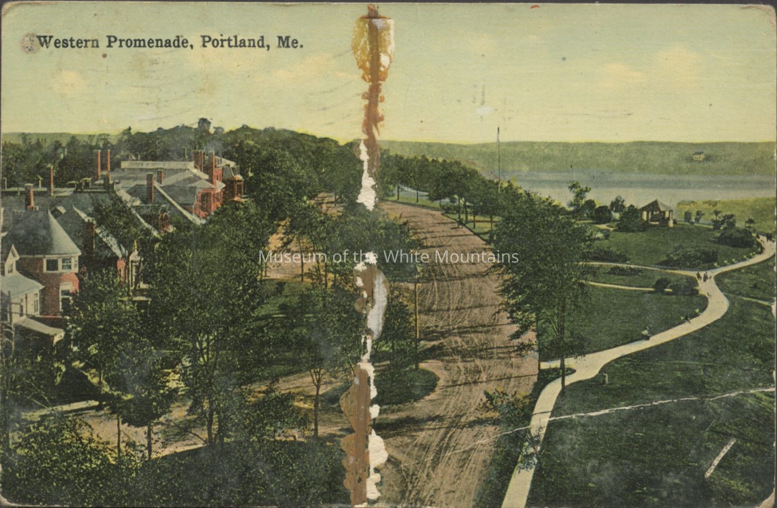 Colored image of buildings along a dirt road, with a body of water in the background. Caption reads, “Western Promenade, Portland ME.”