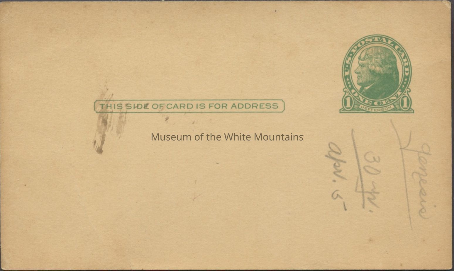 Plain front with only a icon reading, “U. S. Postal Card, One Cent, Jefferson; This side of card is for address,” in green print. Includes some handwriting.