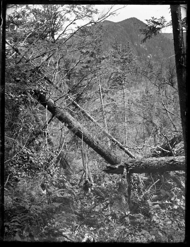Image includes two fallen trees, parallel to one another, leaning toward the left-hand frame of the image. Another tree has broken from its stump and is leaning out of the right-hand side of the frame. In the center of the image, underneath the left-leaning trees, is a hat-wearing youth holding a doll with his or her left arm and looking right at the photographer. The image is populated with other trees, undergrowth, and ferns. A prominent peak is visible in the background, while another peak or two are partially obscured by a tree.Collection