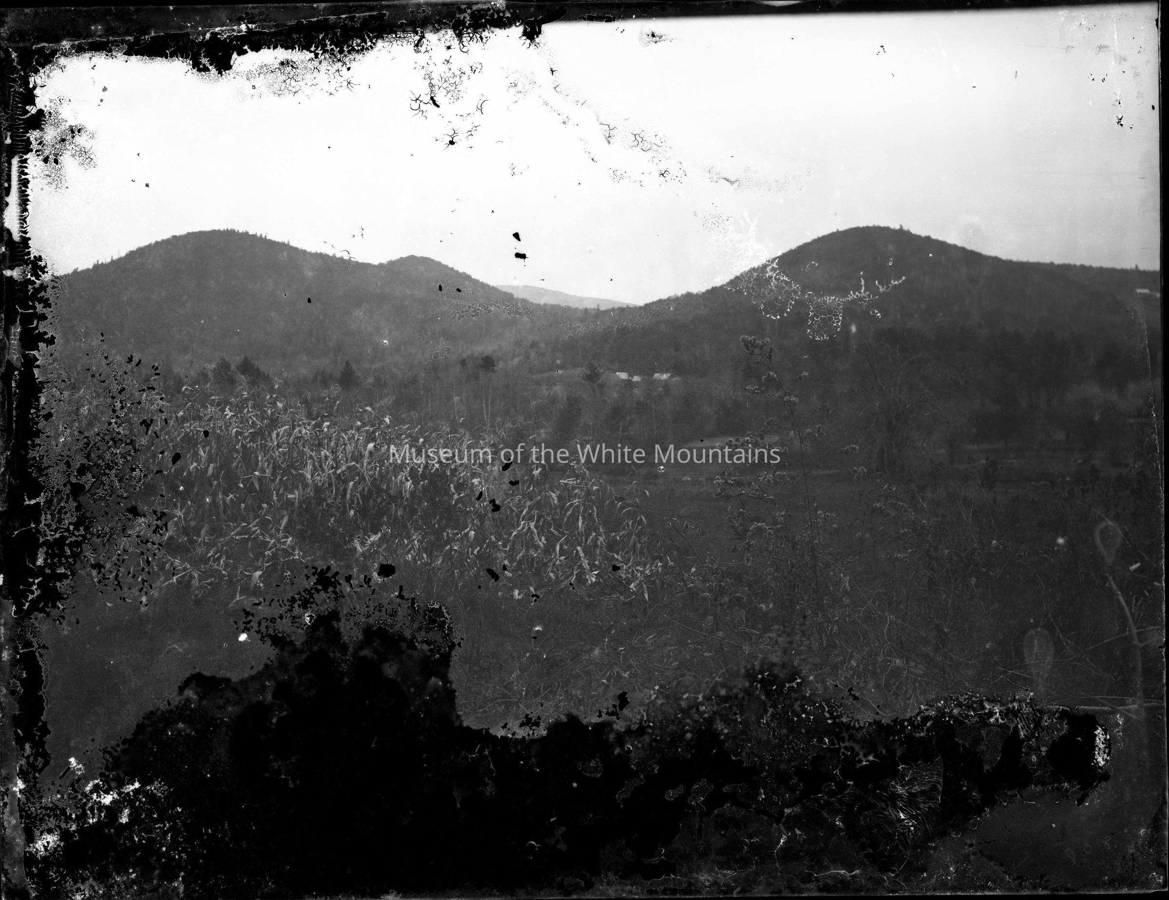 Image largely obscured by damaged emulsion. To the left of the foreground stand a dried out crop, apparently corn stalks, and to the right tall grasses or wildflowers. In the middleground appear the roofs of three buildings, and in the background three rolling hills and far away, another peak. The sky takes up about 1/3 of the image.Collection