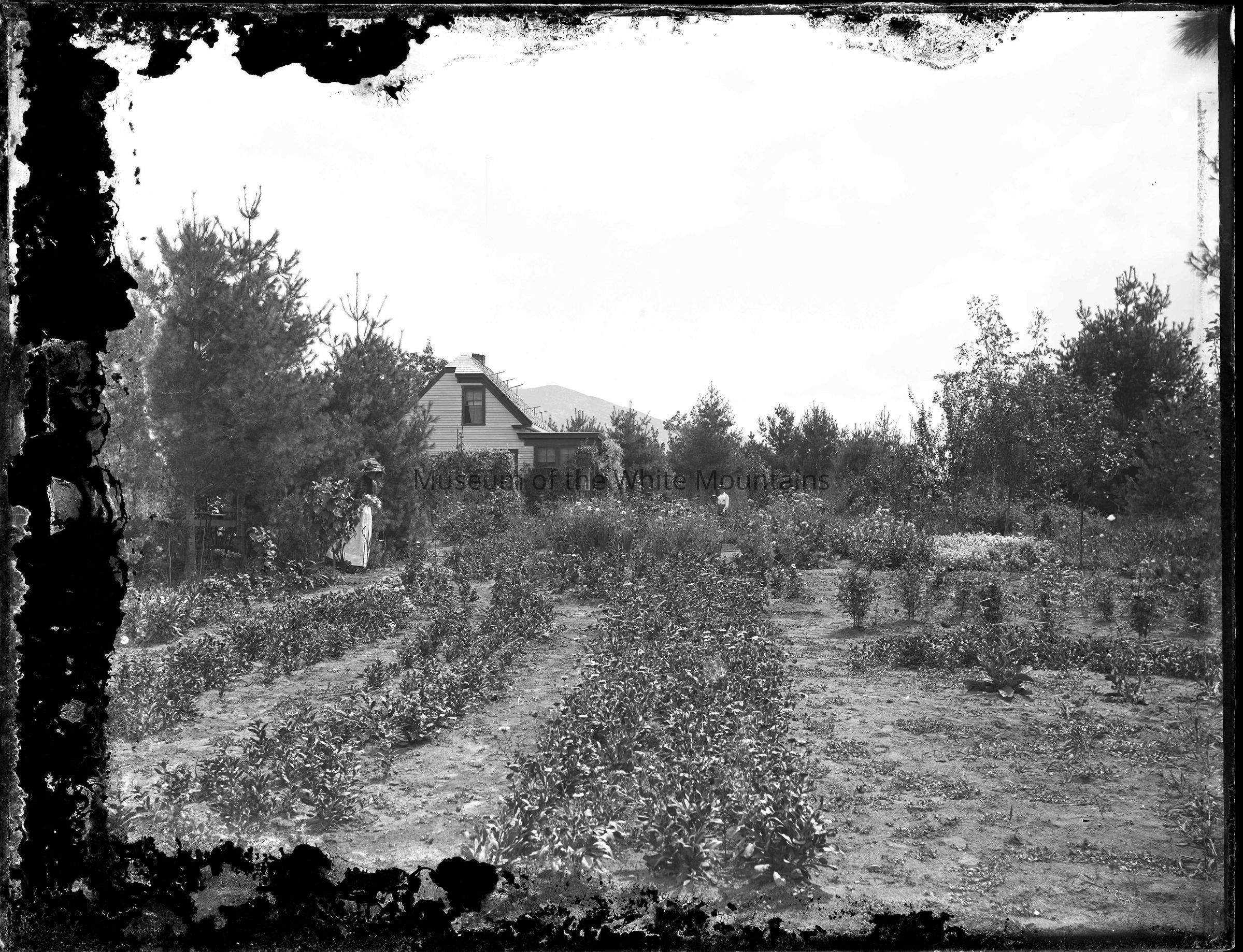 This is a wider view, with fewer people pictured, than Object ID MWM2010.0001.2920. The foreground is covered with rows of planted crops or flowers. In the background are taller flowers, and to the left further in the background sits a house partially covered in ivy. Not far to the right of the house is a man holding a bunch of flowers and wearing a hat with a ribbon around the brim. To the left of the house and farther forward in the image is a woman, also holding flowers and wearing a large hat that partially obscures her face. She appears to be wearing a white apron. Not far to her left, near the ruined emulsion, two chairs and a table are visible through some trees and other foliage.Collection