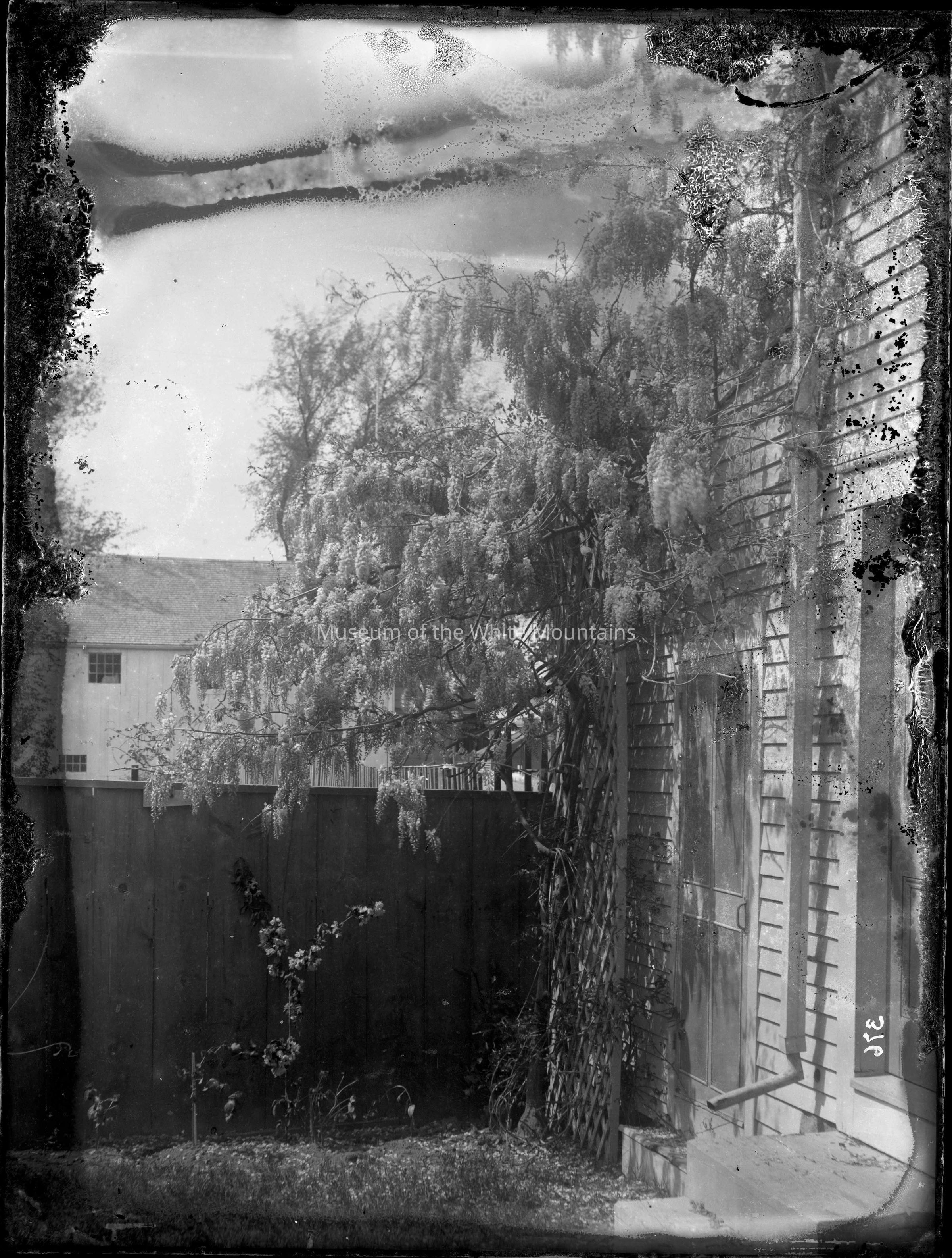 To the right of the image, at an angle, a house with a door and a drainpipe is visible. A tree abuts the left corner of the house, with a trellis in front of it. A wooden fence runs horizontally across the rest of the image, with a house or other building visible behind it and grass and some flowers in front of it. 376 is written in the lower right hand corner of the plate.Collection