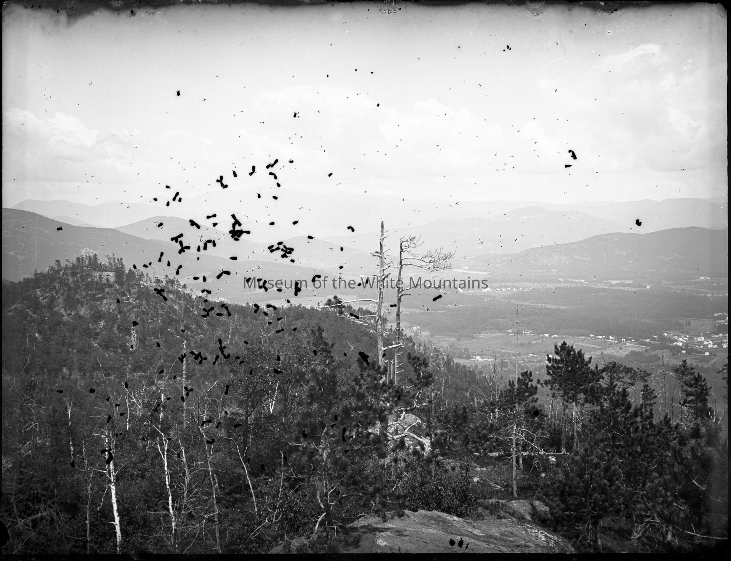 Image includes boulder in the foreground as well as bare trees and pines. Taken from a height overlooking fields, farms, houses, and other buildings. A series of hills rise in the background. May have been taken in North Conway, as White's studio was located there.