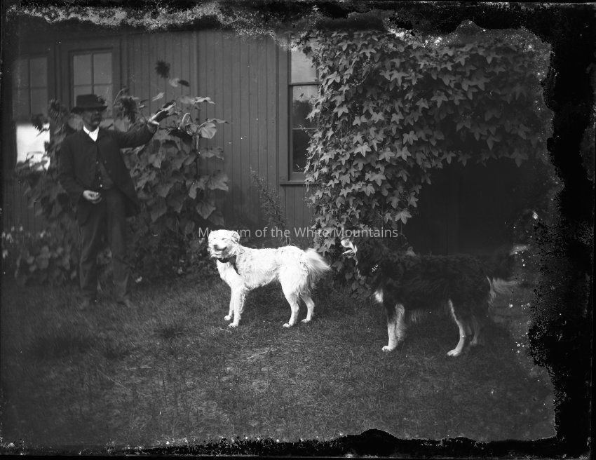Image includes two dogs at the right hand side of the picture. One has both dark and light coloring and one is light all over. Both have long fur and wear collars. They stand on grass before the wall of a building, which has three windows. Behind where the dogs stand the wall is covered in ivy. To the left is a man dressed in a hat and a jacket standing in front of the same wall, which in that place has sunflowers before it. He is motioning toward the dogs, or throwing something. With the other hand he holds something indiscernible, possibly food. This image may have been taken in North Conway, where White had his studio.Collection