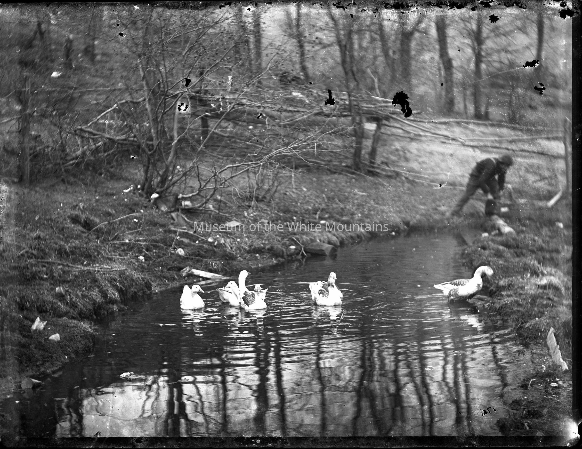 Streams, Chopping wood, Hats, Trees, Bushes, Water animals, Wood cutting, Rivers, Woodcutters, Ducks, Water