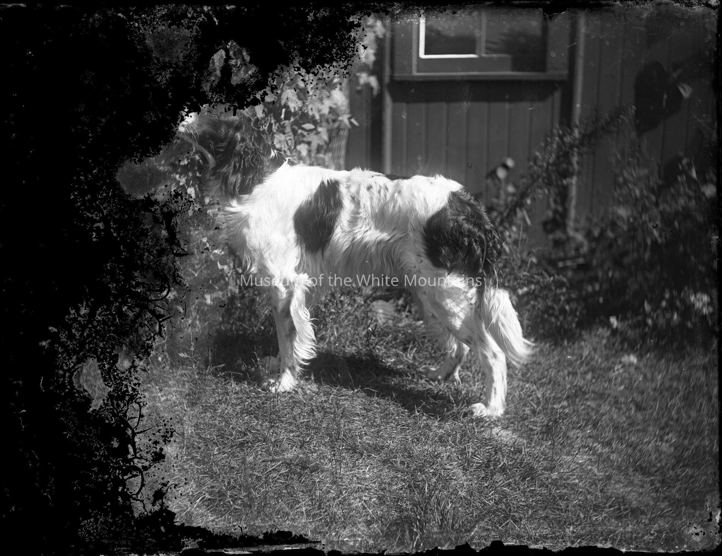 Image of a dog, with a light coat and darker spots, standing on grass in front of a building which appears to be the same building as in Object ID MWM2010.0001.2924.