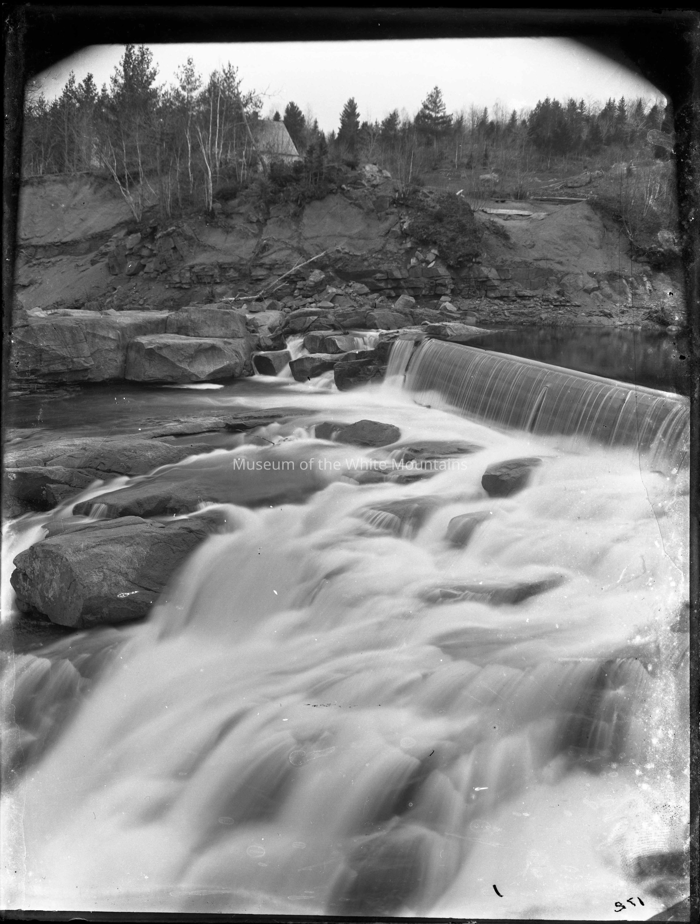 Image of a waterfall going over what appears to be a man-made dam. The still water emerges from the right side of the plate. Once over the fall, water courses over large rocks and boulders. There are also large rocks and boulders in the background, leading up a steep embankment with small trees growing out of it to a small building. There are more trees around and behind the building, which is in the left of the image, and all along the right of the image atop the embankment.