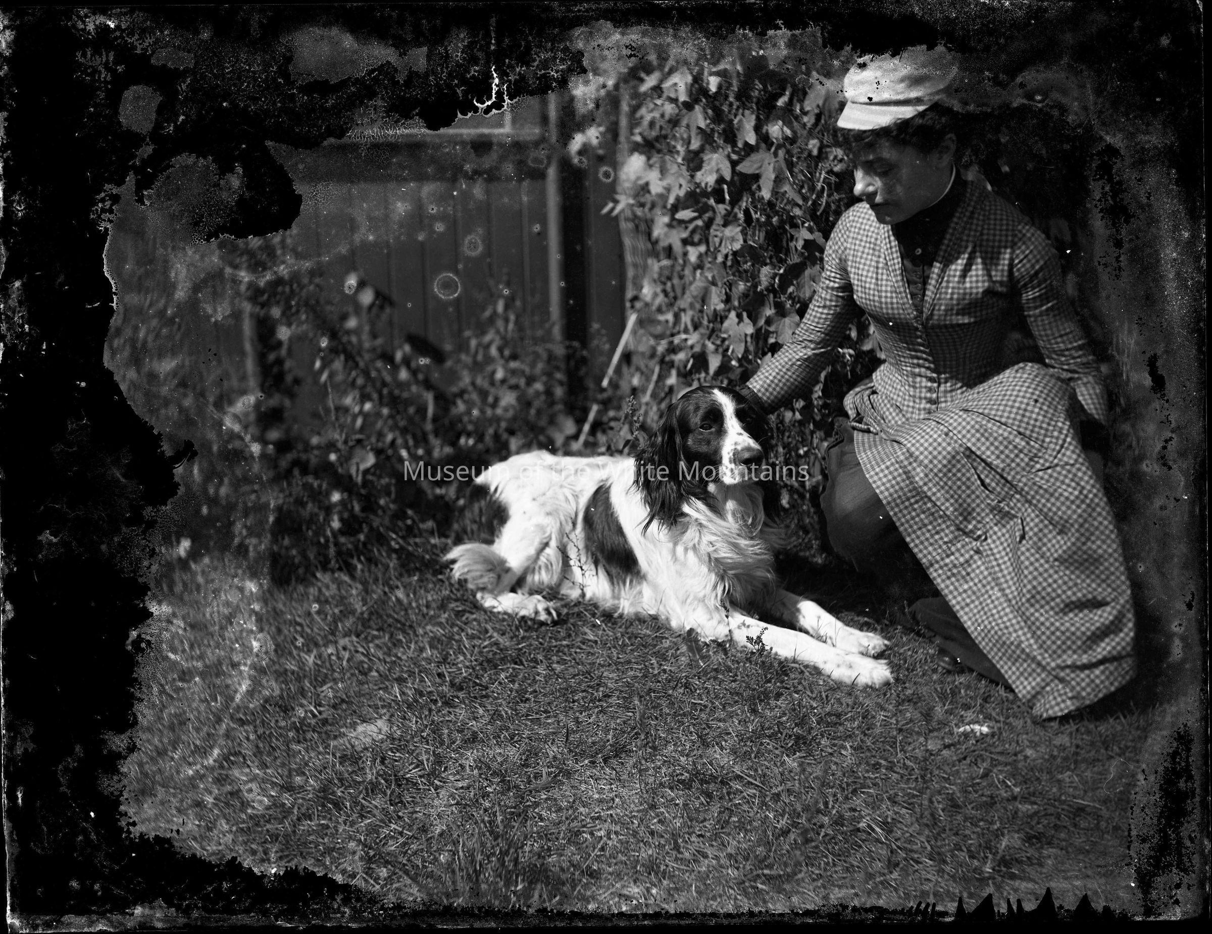 Woman in checkered dress and striped hat is crouching on the ground to pose with a dog, possibly the same dog as in Object ID MWM2010.0001.2928, with a light coat and dark spots. The woman is looking down at the dog, which is looking into the distance. They are posed in the grass, before the ivy on the wall of the building that appears in the afore-mentioned image, as well as in Object ID MWM2010.0001.2924. This image may have been taken in North Conway, where White had his studio.Collection