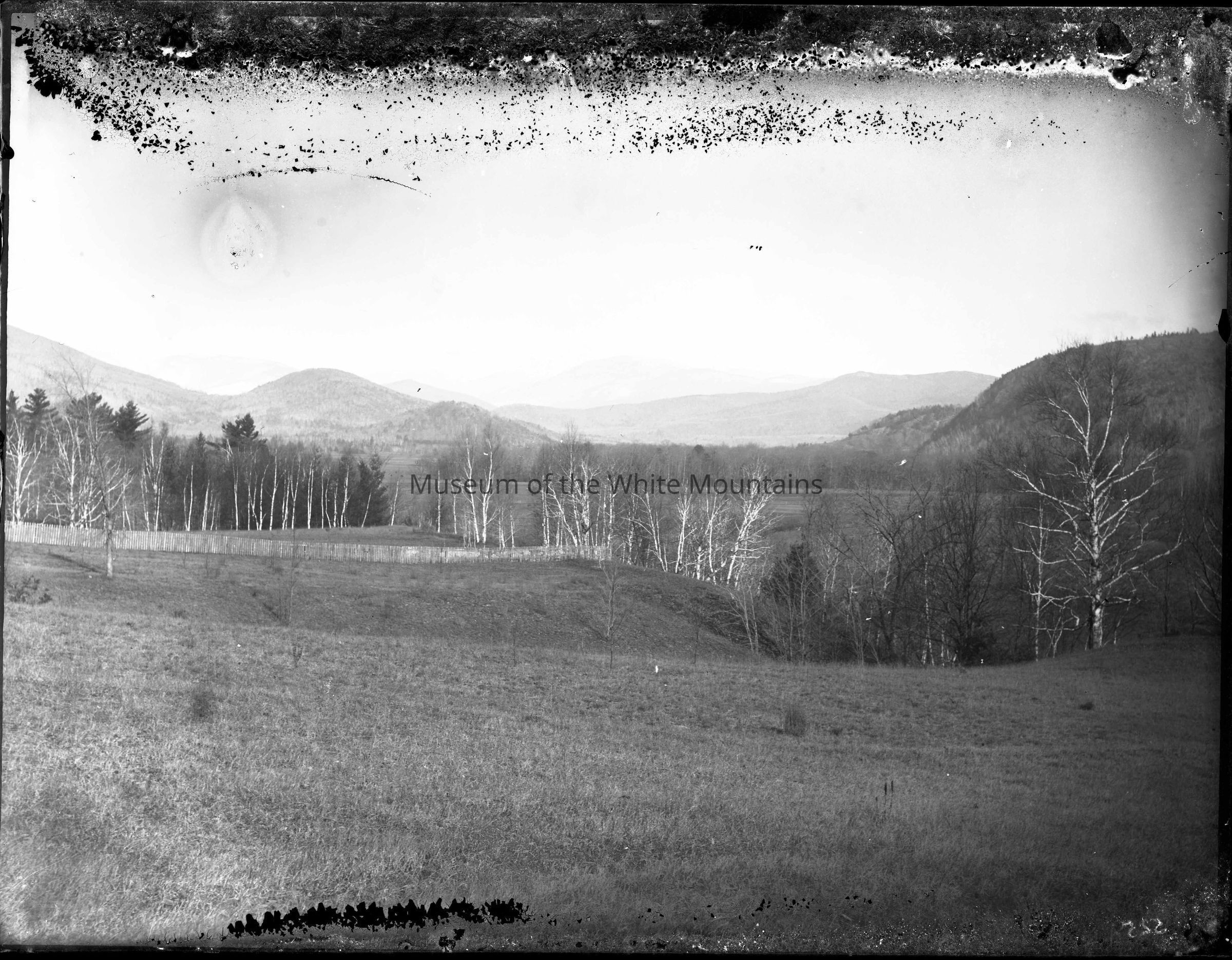 A gently rolling field in the foreground dips about midway up the image to a hollow on the right hand side, where trees grow. A fence stretches across the left 2/3 of the image and trees grow beyond it. Farther back is another field, and then a series of hills and possibly mountains rise to the sky. 525 is written in the bottom right corner of the image.