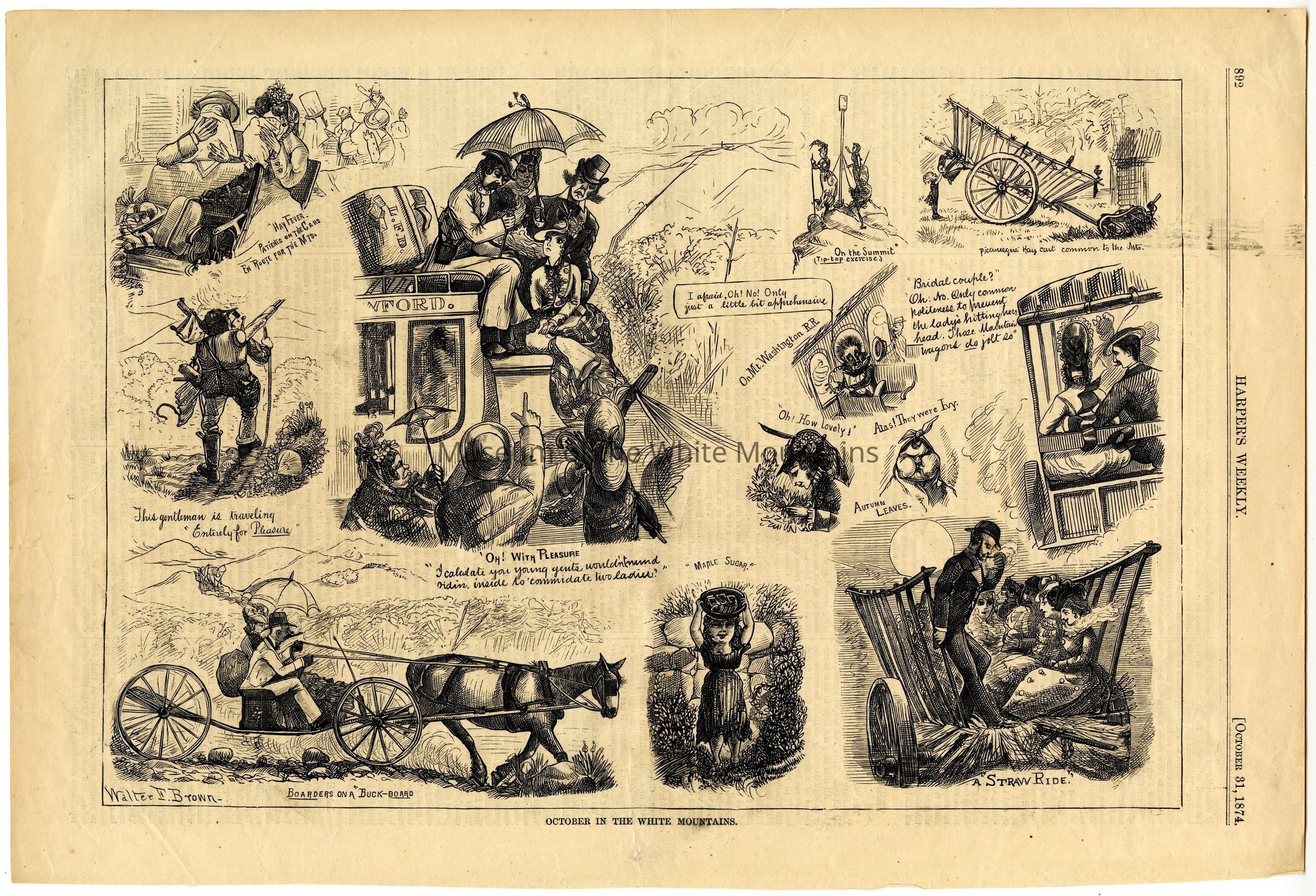 A page from Harper's Weekly dated October 31, 1874. The front contains a collection of engravers with the caption of 'October in the White Mountains.'Type of Print