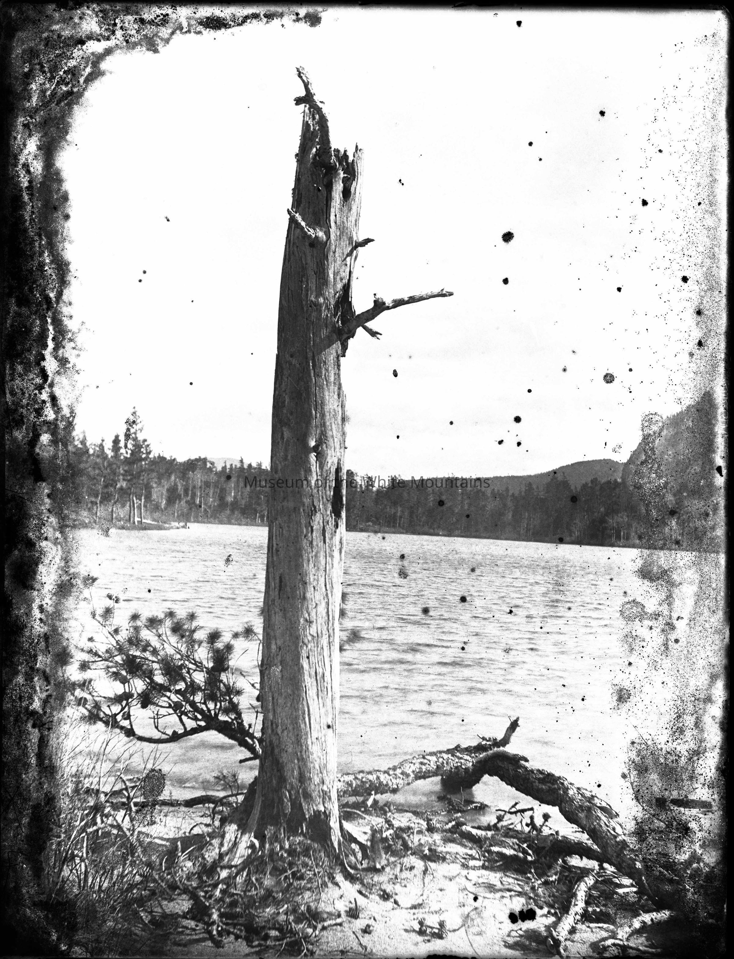A dead tree stands (possibly in sand) at the edge of a body of water, possibly a river or a lake or pond, with a fallen branch at its roots. In the background on the other bank of the water are a row of pines and in the right side of the image a hill rises.