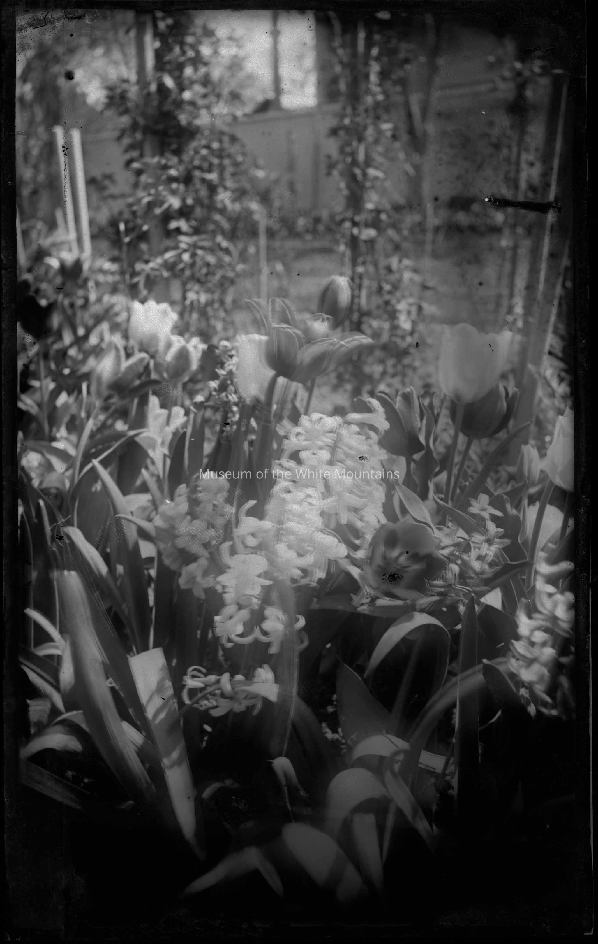 Tulips and hyacinths dominate the foreground, with stakes and vines beyond. There are walls and windows, so this image may have been taken in a greenhouse.