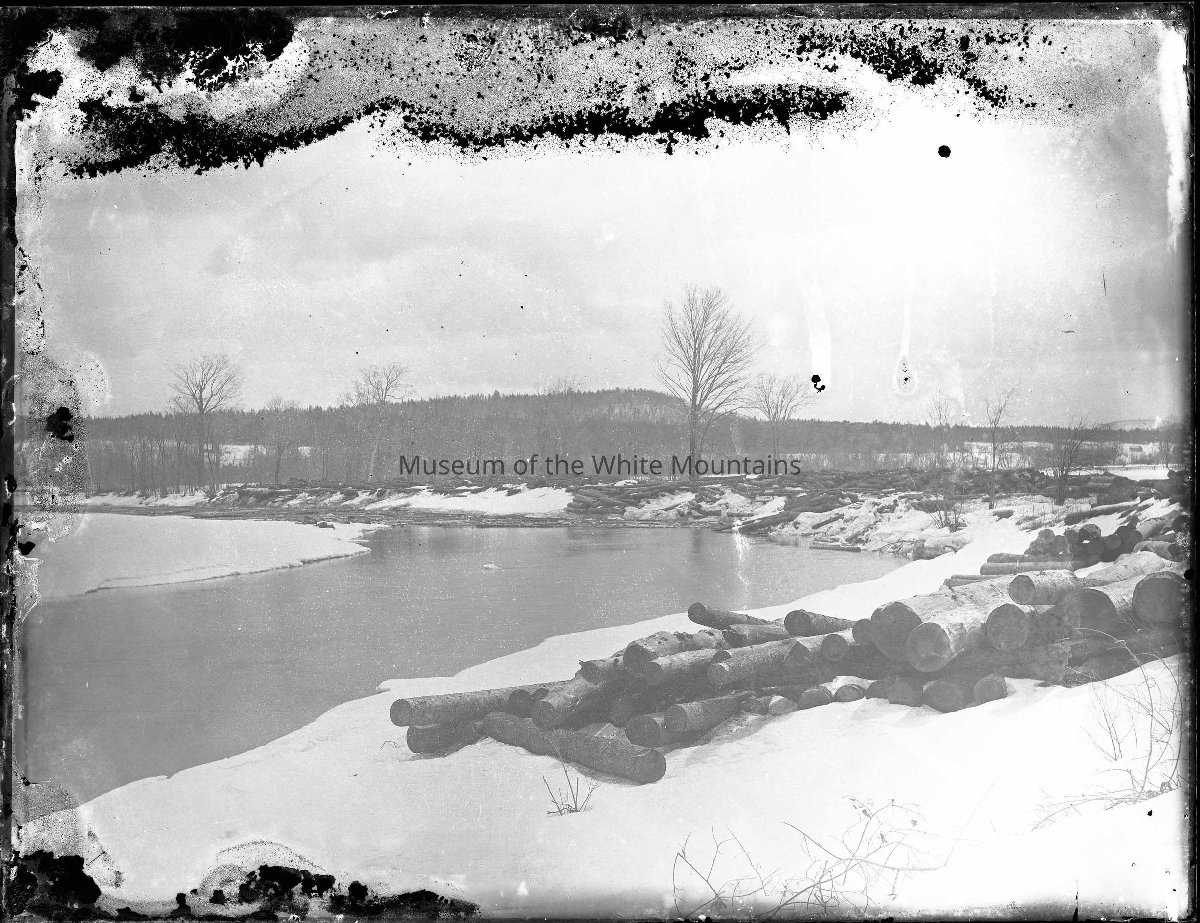 Logs sit on the right bank of the Saco River that cuts through a snowy landscape. Small trees and bare branches of bushes are scattered throughout the space where the logs are piled, and in the middleground there are taller trees and a hill that rises to meet the sky.