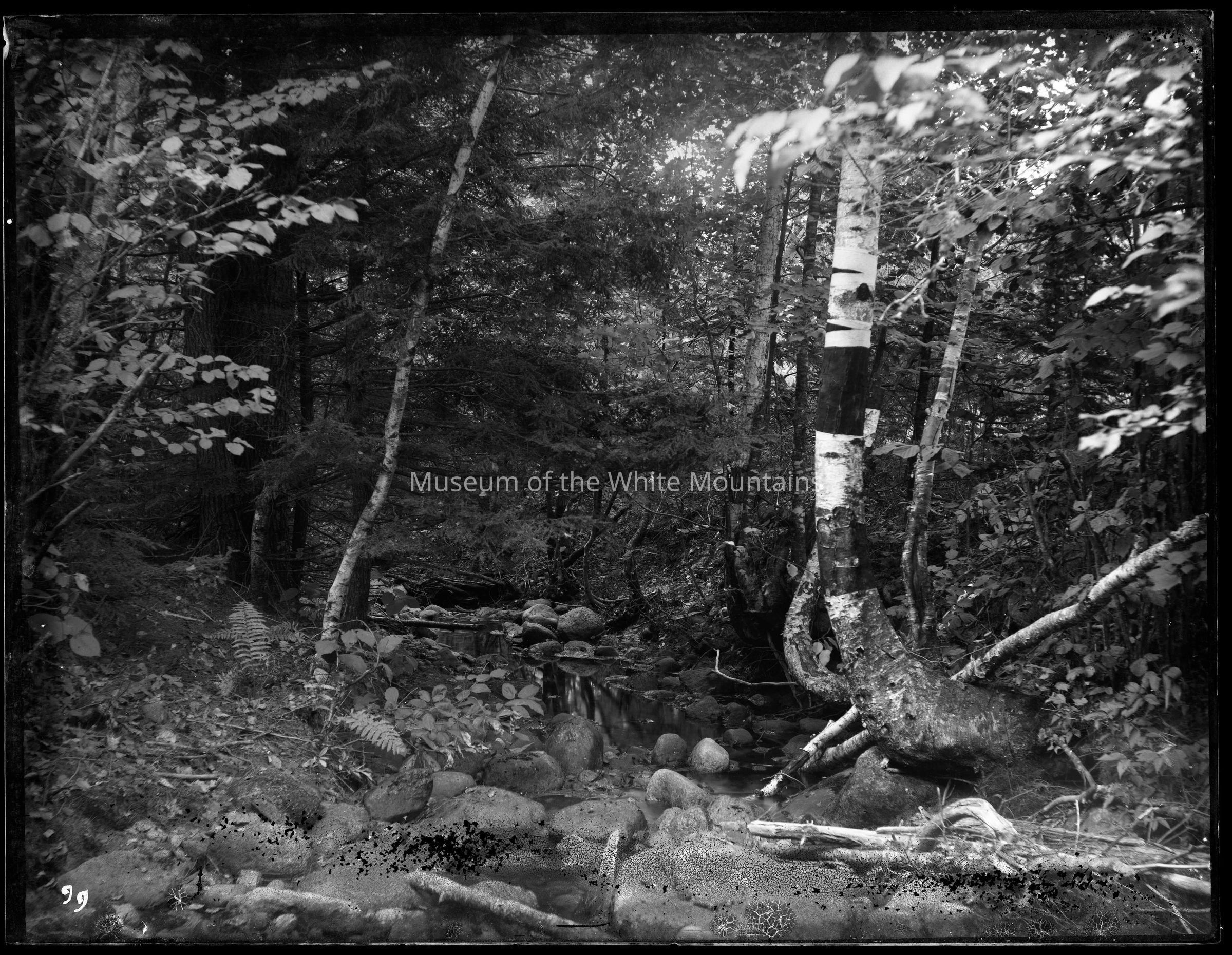 A birch tree with a bent trunk dominates the right side of the image, which is a forest scene. There are rocks and ferns in the foreground and a small stream or brook that runs diagonally from the back of the middleground out toward the viewer and the birch tree. In the left of the image are a couple of pine trees and in the background are many more trees along with the vegetation of underbrush. This image may have been taken in North Conway, where White had his studio.