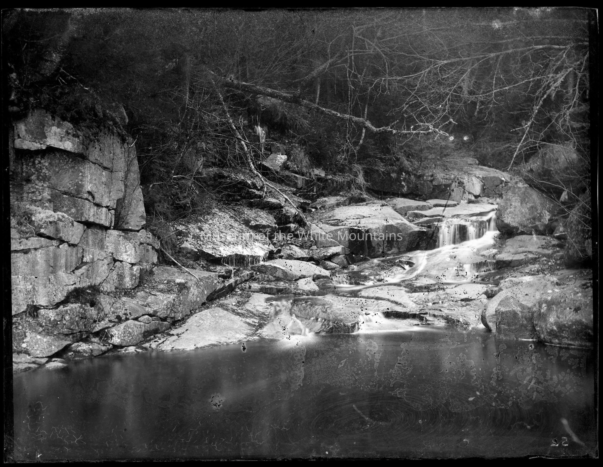 In the right side of the image, water falls over a series of rocks into a still pool. In the left side, a rock cliff rises to obscured vegetation. There are trees with bare branches overhanging the waterfall as well. It also may be related to image #MWM2010.0001.2954.