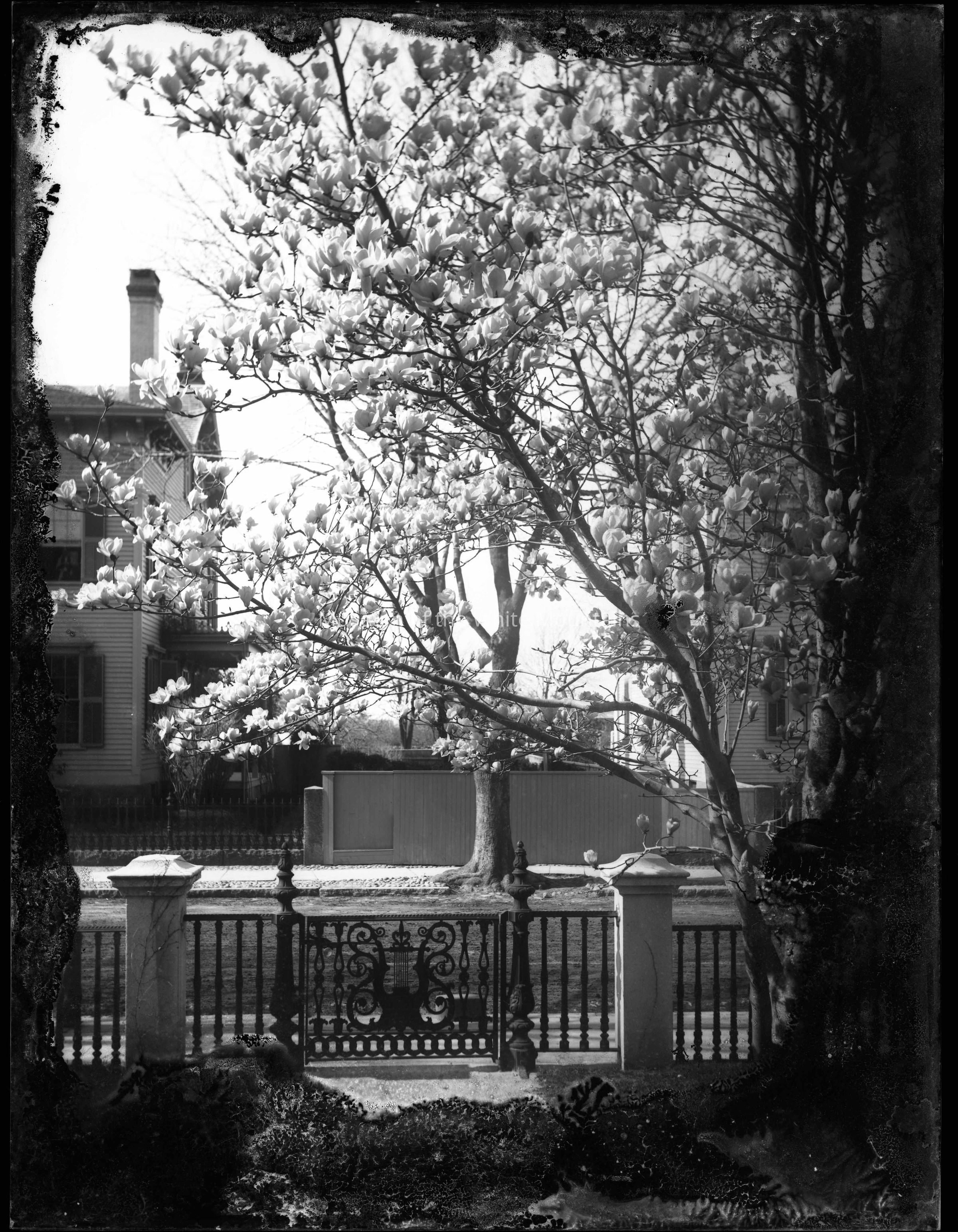 A view from within the doorway, the porch, or the front lawn of a house out past the wrought-iron gate to view the dirt road and the houses beyond. To the left is a house with two stories, a chimney, shutters, and an iron fence in front of it and a wooden fence enclosing the yard to the side. Barely discernible to the right is another house with two or three stories, shutters and an iron fence, because the blooming magnolia tree from the house where this image is being photographed obscures it. This image may have been taken in Massachusetts, where White maintained a separate residence, and may be related to image #MWM2010.0001.2950.Collection
