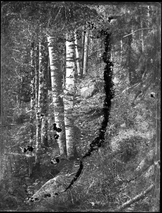 Image shows white birch trees and other trees and vegetation. In the foreground of the left of the image, the middleground of the center of the image, and also possibly to the right of the image there are also some rocks.