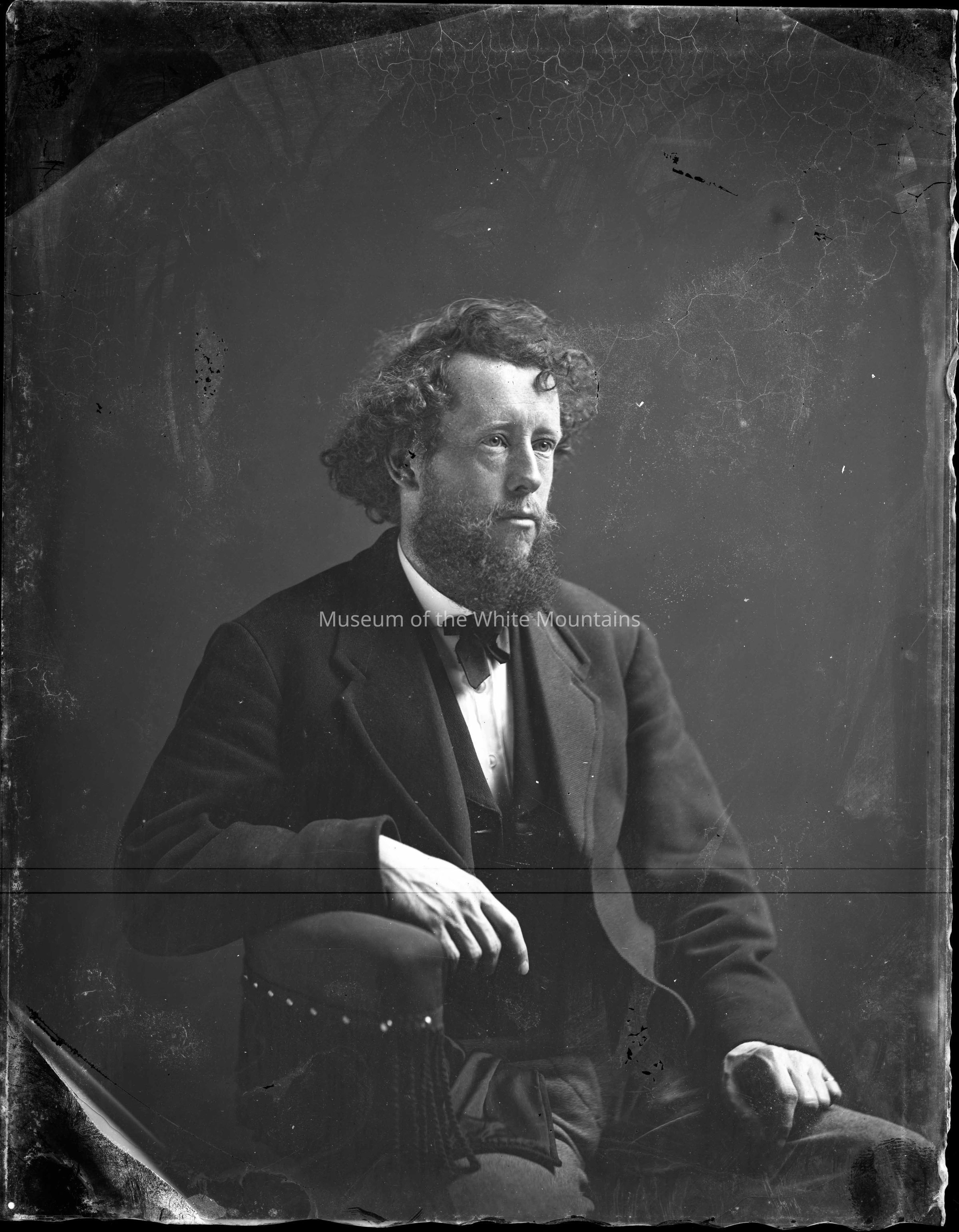 Portrait of photographer T.E.M. White as a younger man. He has curly hair and a curly beard. He is wearing a three-piece suit and a bow tie, and rests an arm on his leg while the arm closer to the viewer is resting on the arm of the chair he is sitting in. The chair arm is tassled.