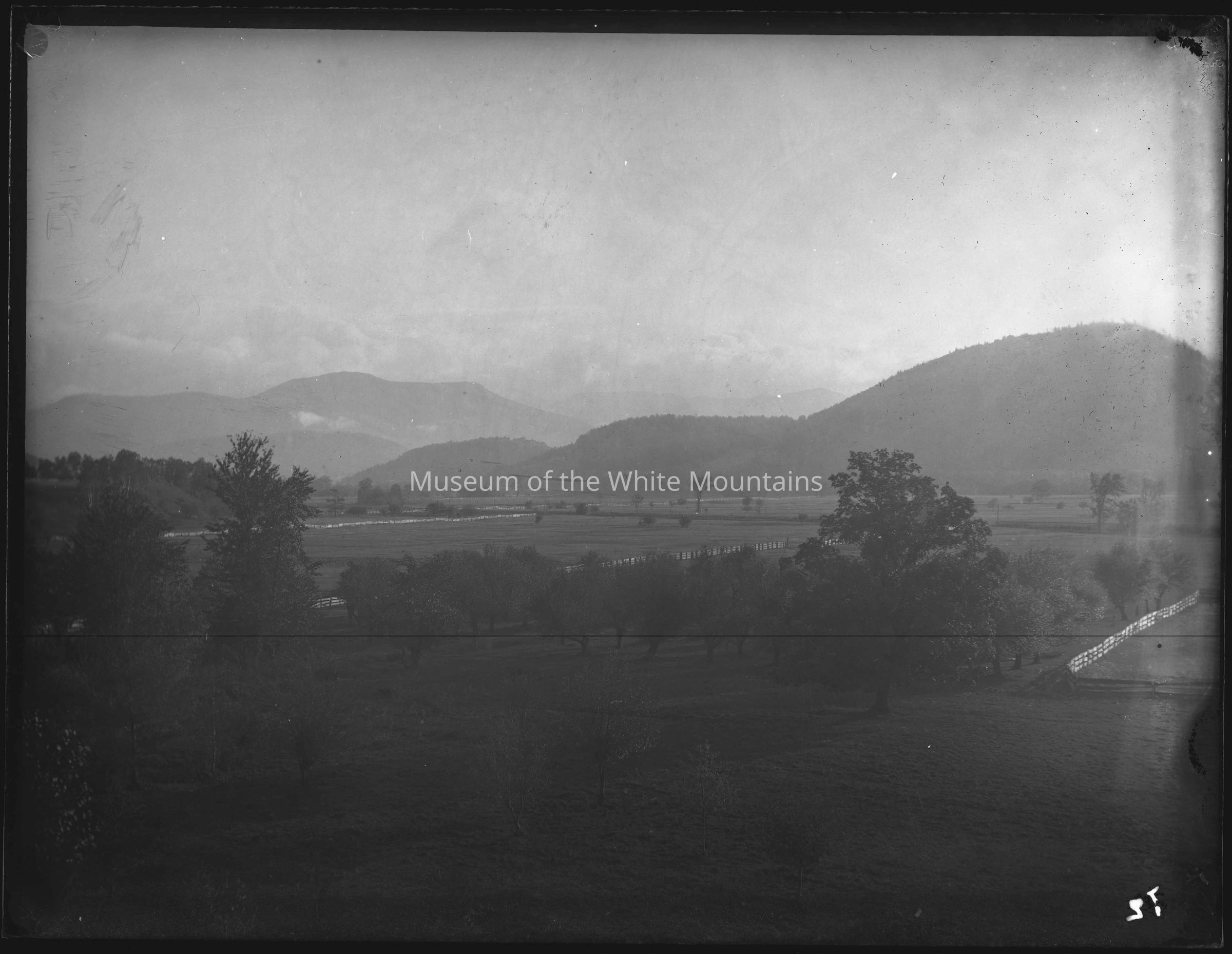 A view of fields separated by wooden fences, with some small trees in the foreground which look like orchard trees. There are some larger trees throughout, and hills and mountains rising in the background. The sky has some billowing clouds.