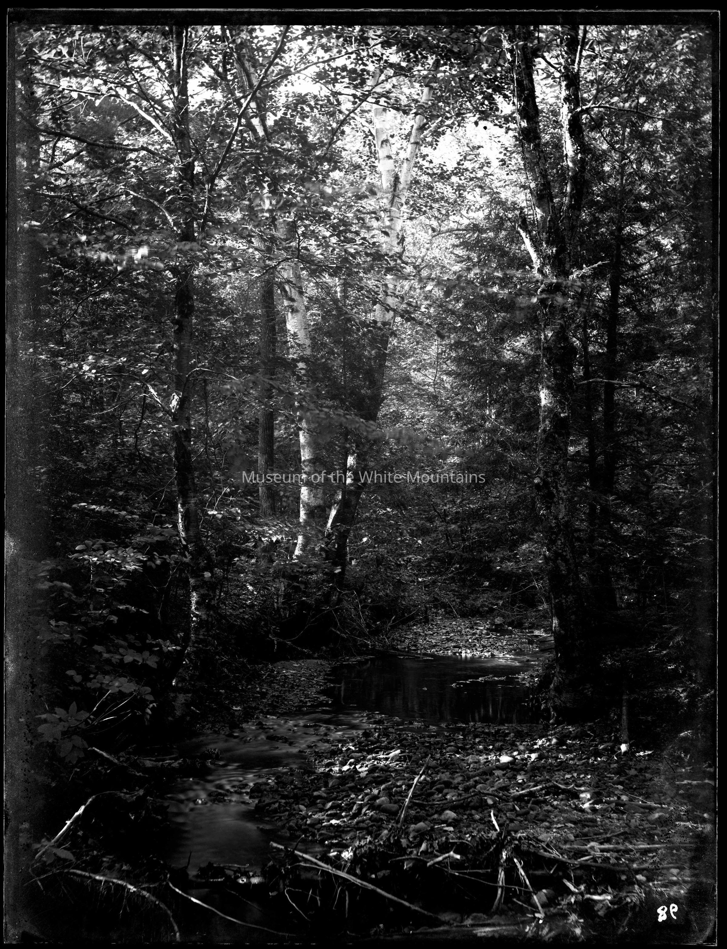 In the center of the image a partially dry stream or brook flows between two banks in a forest. There are many rocks, some medium-sized, some larger, that are in its path. There are also tree branches and sticks in its way. On the right side bank there are trees other vegetation. The left bank takes up more of the photograph and also includes trees, some of which are birch, and vegetation. The stream seems to twist behind the right bank, so that the background is not a point at which the stream originates, but more stones that lead up to part of the left side of the wooded bank.Collection