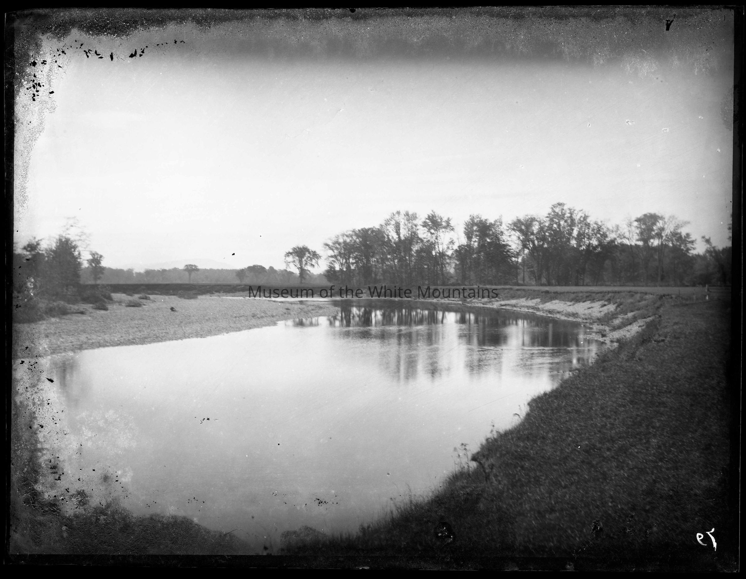 The Saco River cuts through a landscape that includes some trees in the middle ground to the right and left, and a grassy embankment to the right and a sandy beach to the left. The river turns toward the left of the image and in the background also seems to come from the left. In the background are more trees. The image may have been taken in North Conway, where White had his studio.