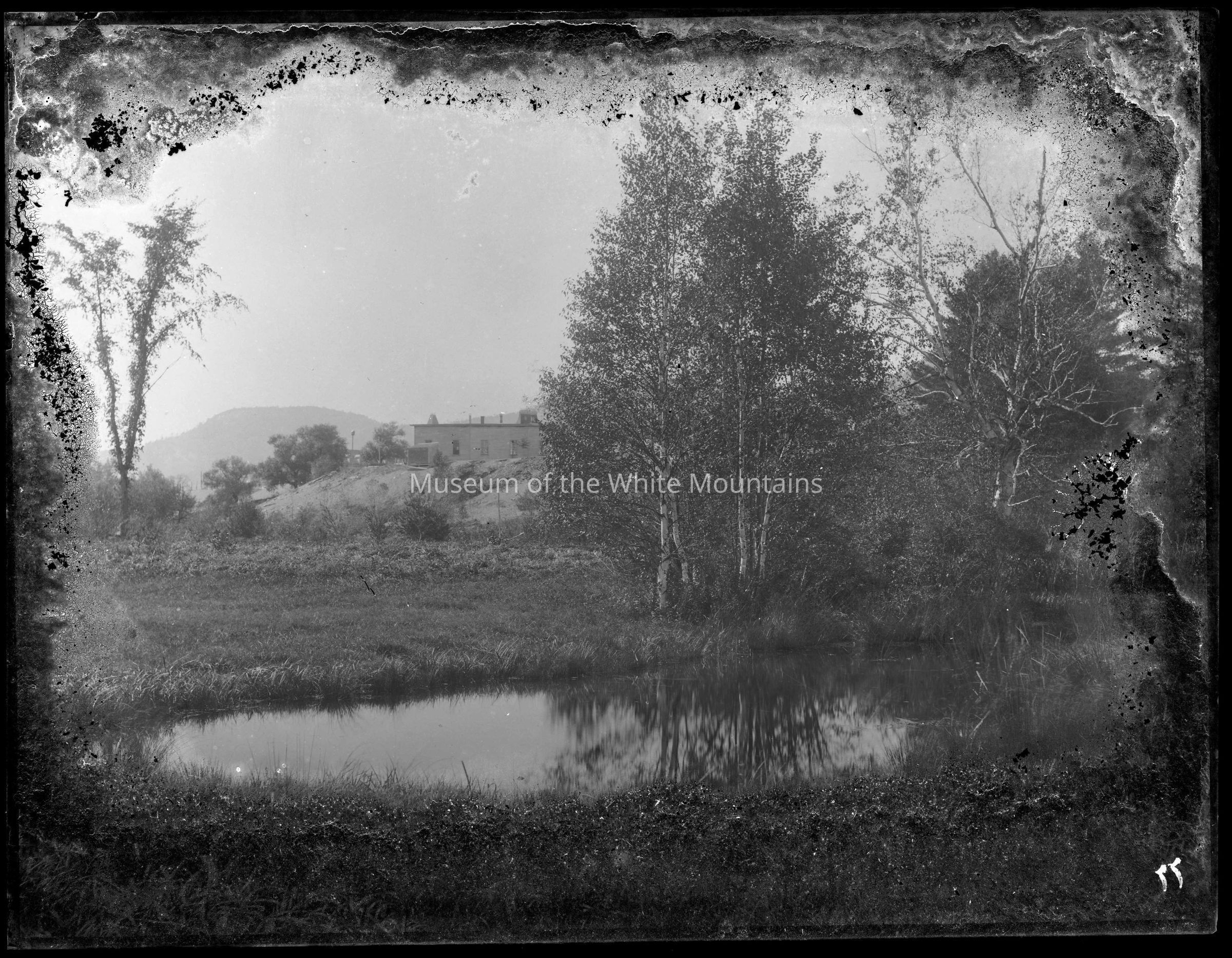 Image is of a pond in the foreground, slightly off center to the left. To the right it disappears into tall grasses and a stand of trees and other vegetation. In the middleground is a small field with a tall tree at the left of the frame, and atop a hill between the center and left of the image sits an industrial-looking building with a number of chimneys and vents. Farther beyond it to the left there may be another building, mostly obscured by trees. Far in the distance a hill or mountain rises to the sky.