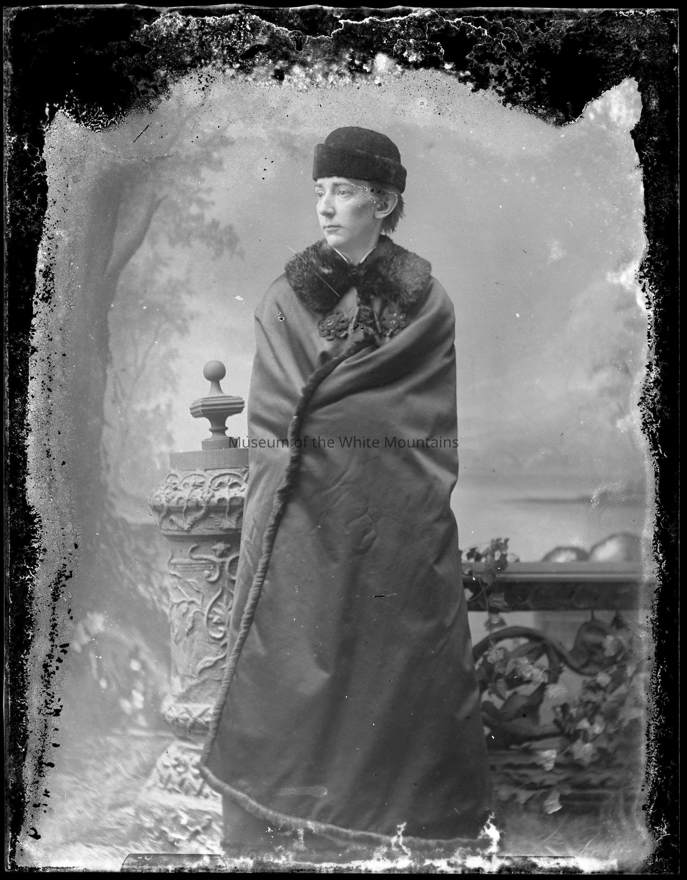 A figure stands before what may be a set piece of a fancy railing with ivy on it. The figure wears a fancy embroidered cape with a fur collar and a fur hat. In the background a tree and what may be water are visible. This may be a set background from the photographer's studio. This image may have been taken in North Conway, where White had his studio.