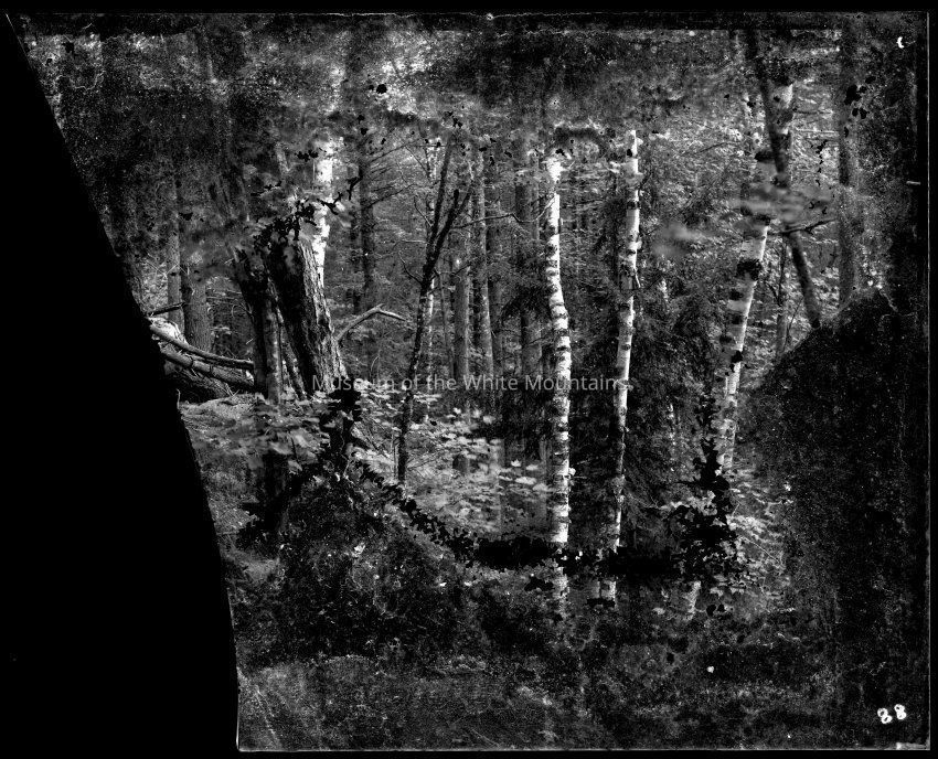 Image is of trees in a densely wooded area. Some are birches and at least one is an evergreen.