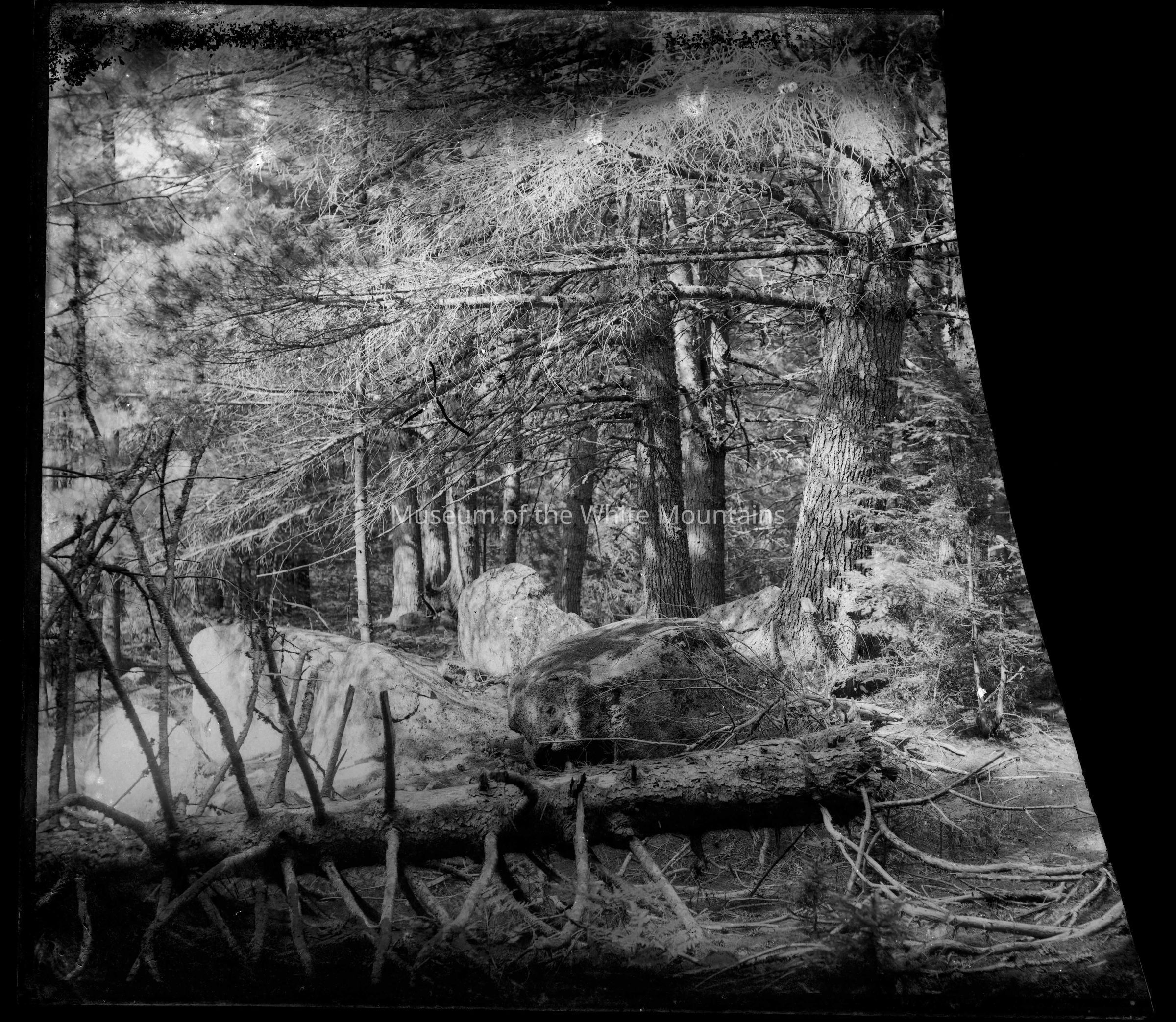 The foreground is dominated by a fallen tree with bare branches sticking out to all sides. Beyond this to the center and left of the image are a number of large boulders which have some pine needles, branches, and sticks strewn about them. To the right of the image and in the middle- and background of the center and left are standing pine trees which fade into the distance, as though this image was taken in a forest.