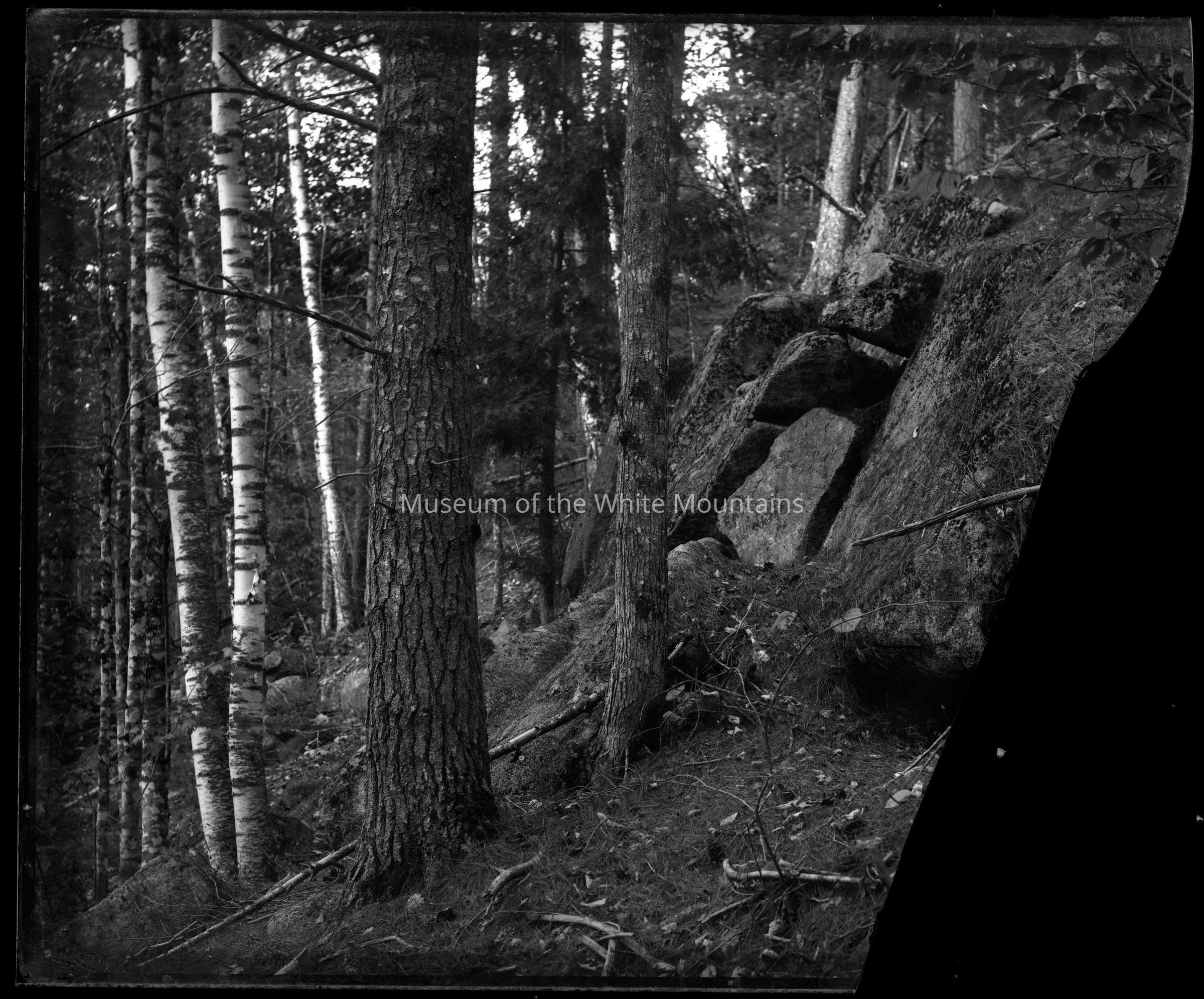 This is an up-close image of two birches and two other trees growing on the side of a hill, with other trees in the forest in the background. The hill is covered with pine needles, sticks, and leaves. Just to the left of the trees is a large boulder. It seems to be comprised of a number of rocks fused together. In the top right corner, some leaves from a bush or other vegetation can be seen hanging down over the boulder.Collection
