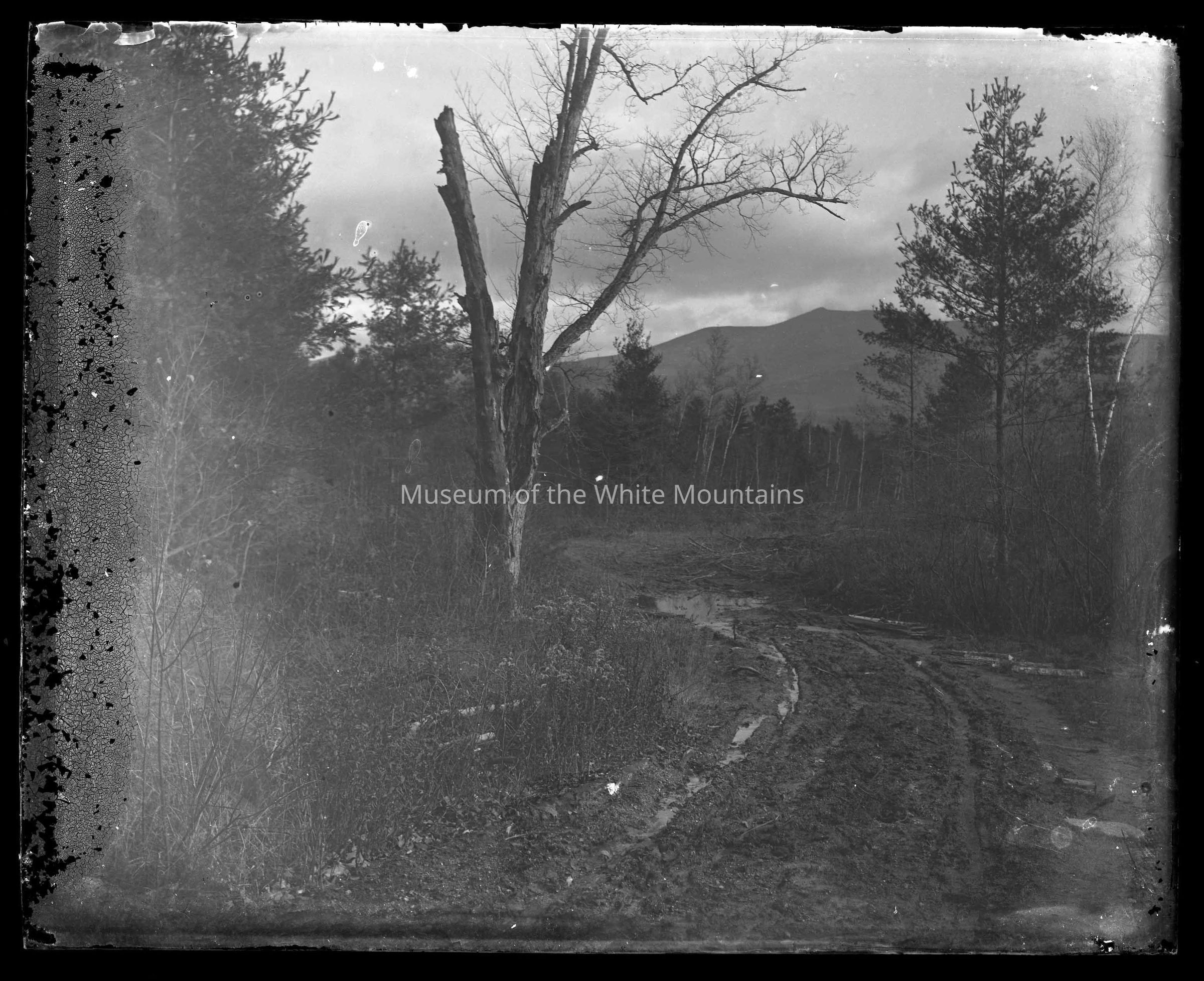 Image of a muddy road with trees on either side as well as a mountain in the background. There are low fluffy clouds hanging above.