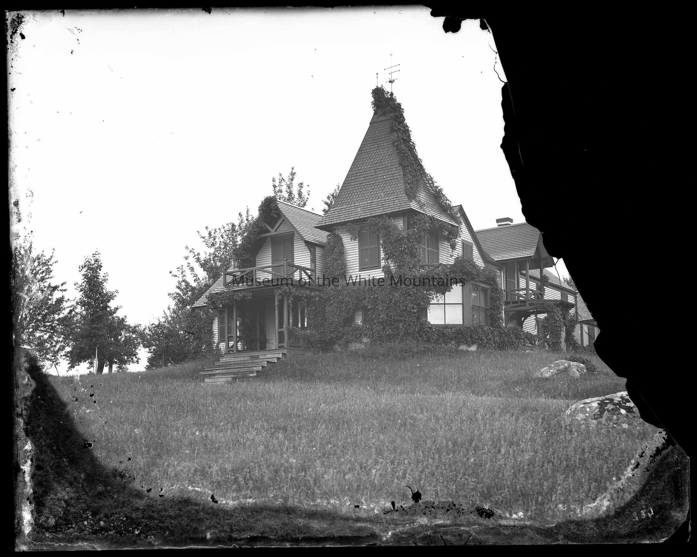 View of a house done in the carpenter gothic architectural style (also known as the rural gothic style). Typical with the carpenter gothic characteristics there are profusions of jig-sawn details, board and batten siding, and steep gables. The doors and the majority of the windows are closed and covered with shutters. The windows on the bottom left hand side of the house are visible. Topping the steeple is a weather vane. The house is covered, particularly on the larger steeple, with a climbing plant. There are two rocks on the right side of the image and trees in the background.Collection
