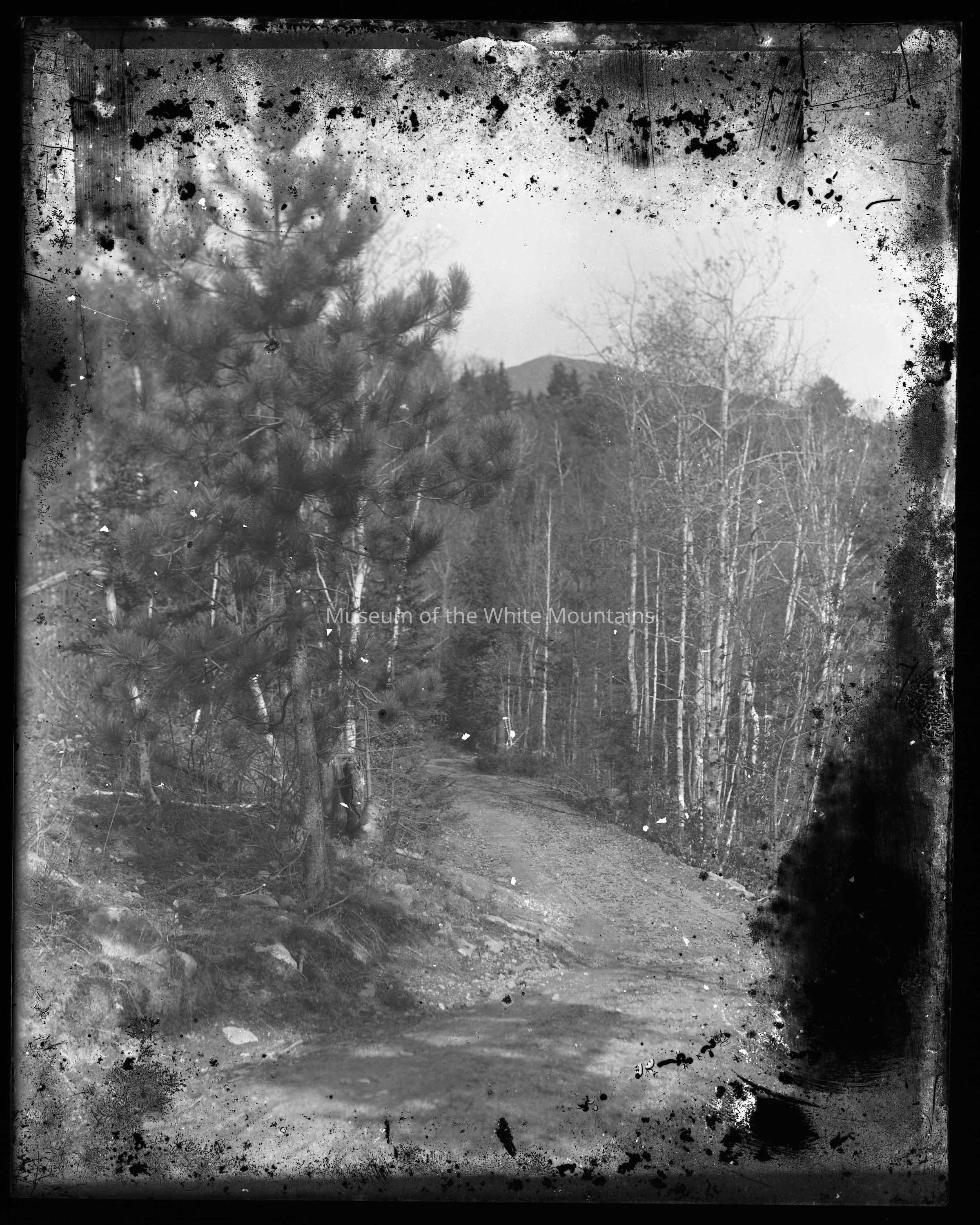 View of a dirt road running through a thick forest, with a mountain peak in the background. Fir trees are seen in the left foreground, while white birches are to the right.