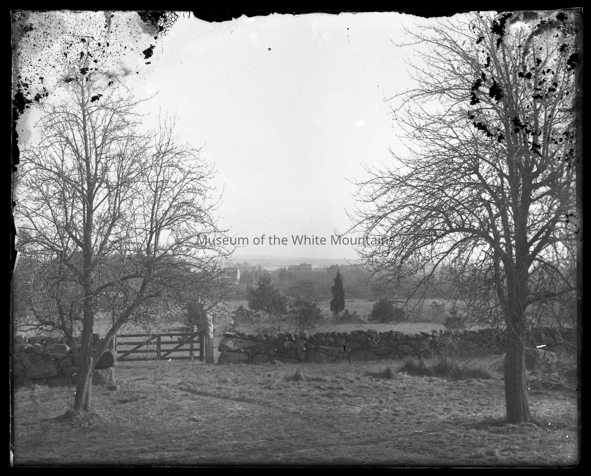 A stone wall with a fence door runs through a field with scattered trees. Two trees are in the forefront on both the left and right sides. The outline of a small town is seen in the background. Possible photographed in Conway, NH where White worked in his studio.