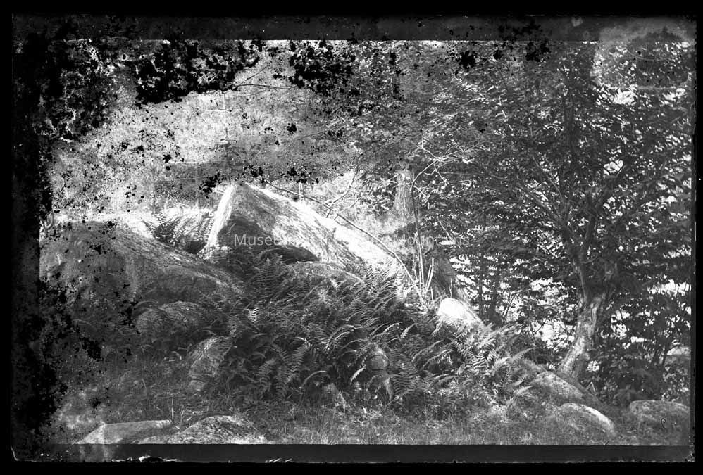 Two large rocks are the main focus of the image, possibly sitting on a hill or mountain. An abundance of ferns grow around the base of the rocks. A tree with a large canopy is situated to the right in the background and other trees can be seen on the left. May have been photographed in Conway, NH where White worked in his studio.