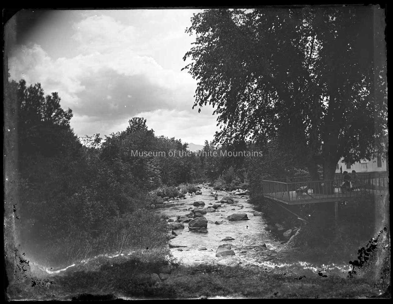 A large tree dominates the left side of the image as two women in Victorian dress sit on a bench situated on a deck built around the tree. A church can be seen behind the tree. A man stands in the middle of river, filled with scattered rocks. Trees surround the river. Related to image MWM2010.0001.3006