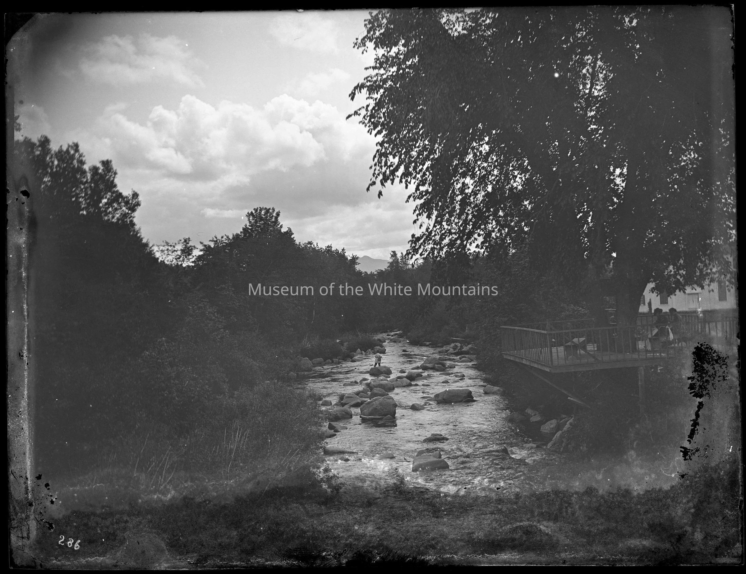 A tree dominates the left side of the image as two women in Victorian dress sit on a bench situated on a porch built around the tree. A church can be seen behind the tree. A man stands on a rock in the middle of the river running through various rocks. The river is surrounded by trees.