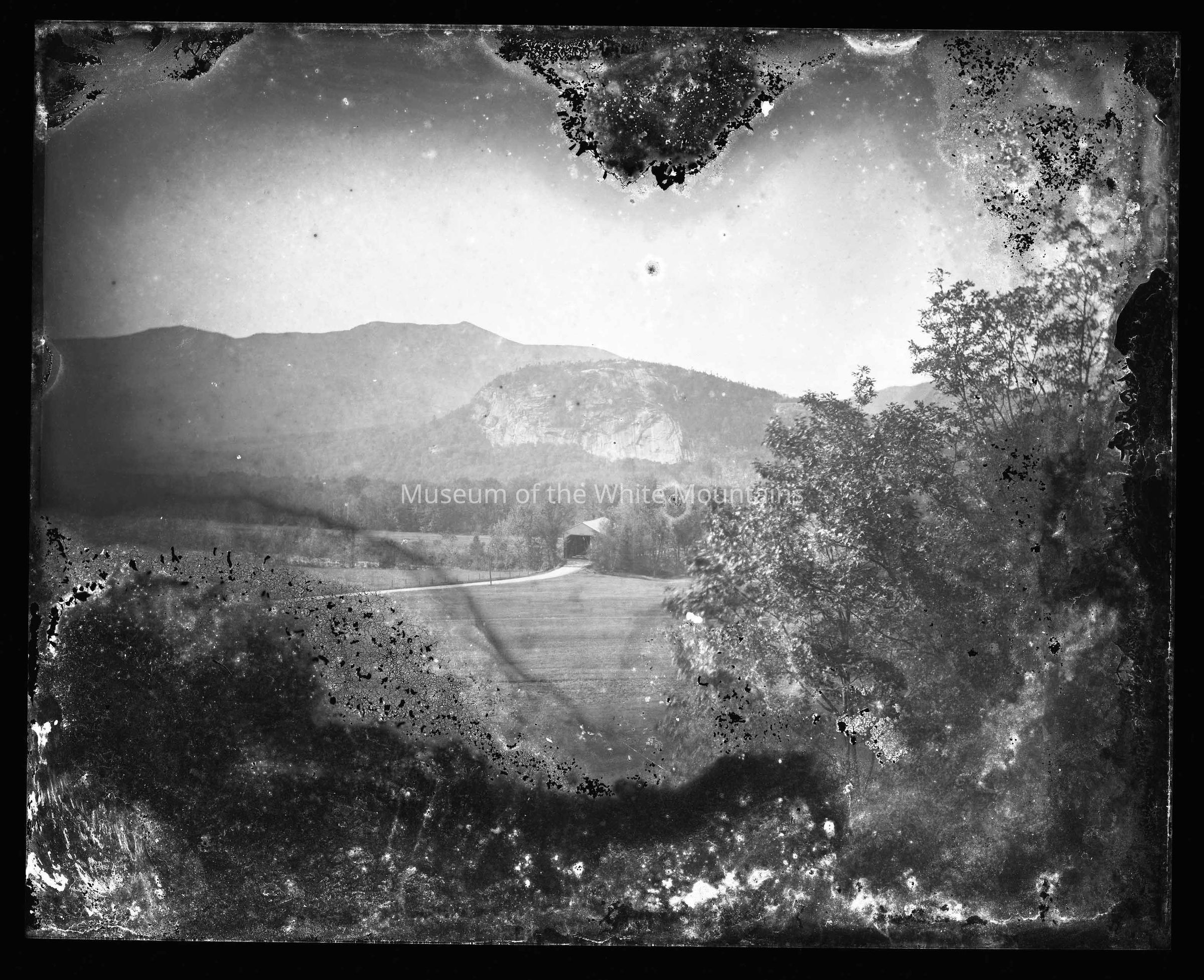 Far off view of a Covered Bridge. In the foreground is a field, and in the background are some woods and a mountain.