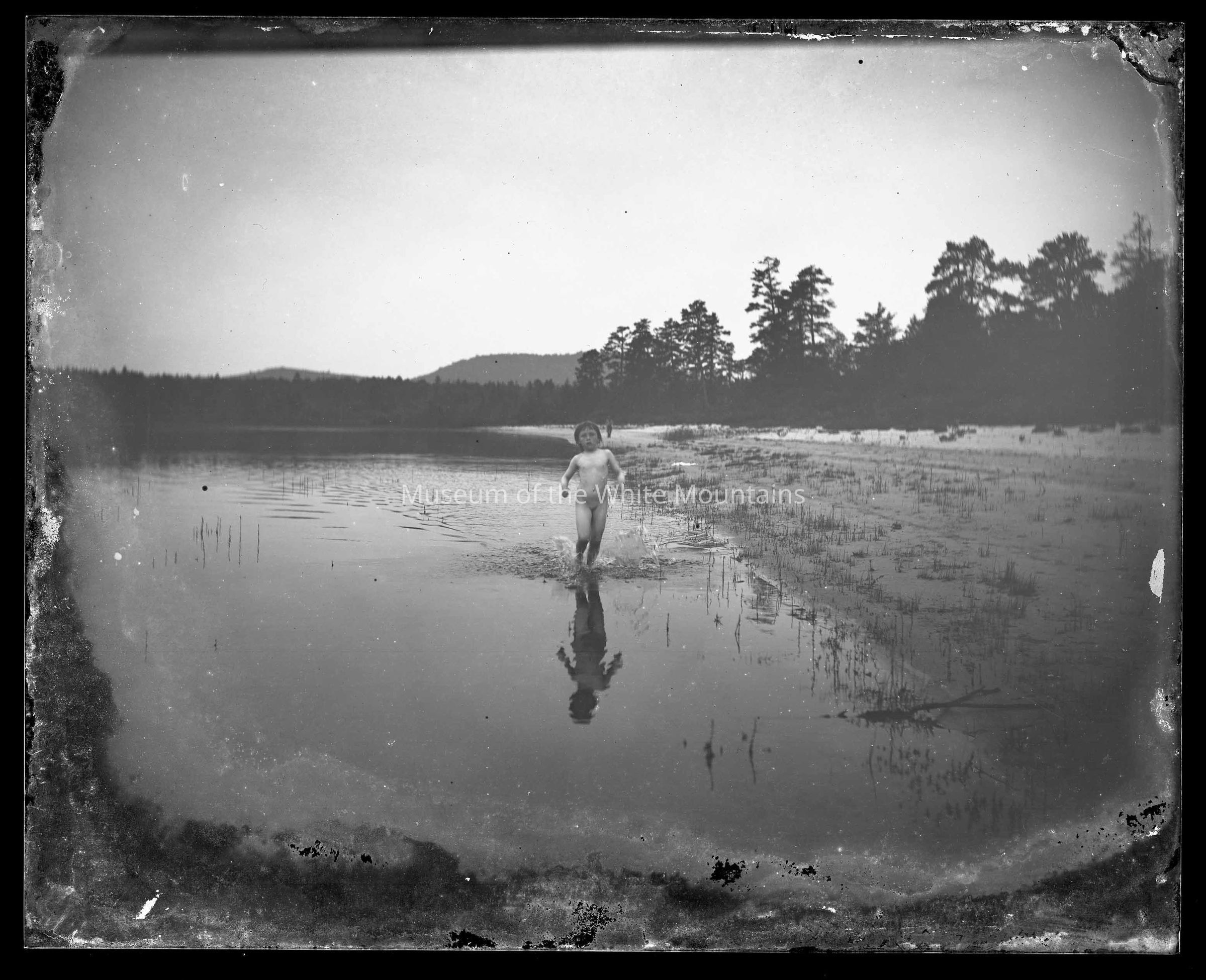 View of a lake front beach, with a small child running through the water. In the background is a mountain. The was probably taken during the summer months. This image may have been taken in North Conway where White had his studio.