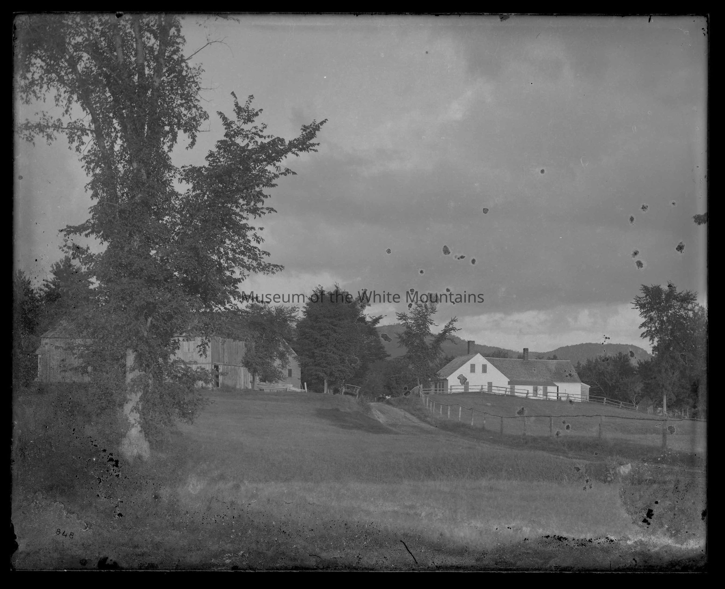 View of farmland. There is a main house, two barns, a road with a wooden fence, and a wagon. In the corner of the image is the number 848.