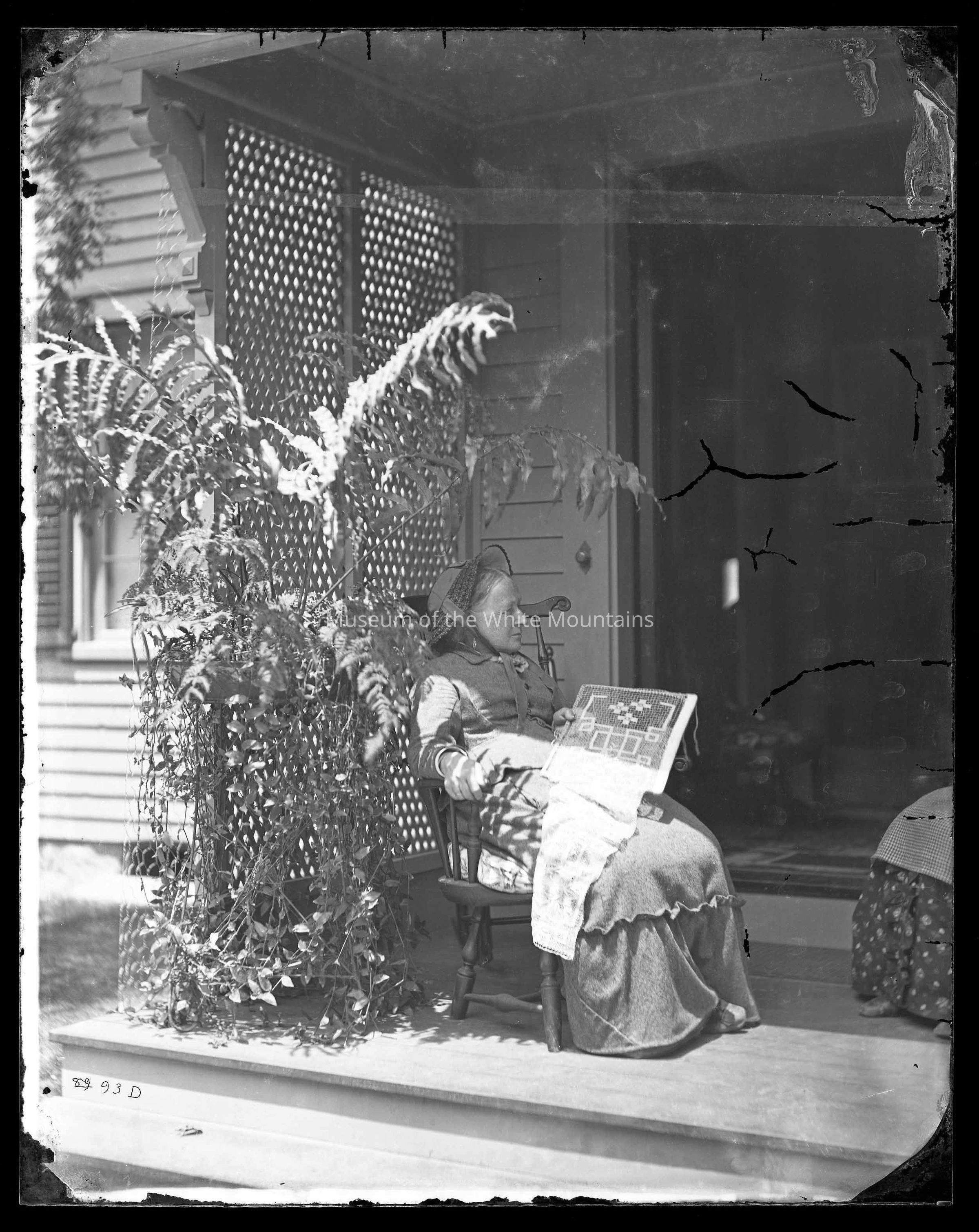 The image depicts one elderly women working on a sewing project, and the skirt of another women is in the corner, both sitting on a porch. In the left hand corner the "53 93 D" is etched. A similar T.E.M. White photo has been found in the New Bedford Whaling Museum Collection (item number 2000.100.90.27). The woman is identified as "Mrs. Keziah Russell Price, widow of Benjamin Price, knitting on her porch, 102 Pleasant Street."Collection