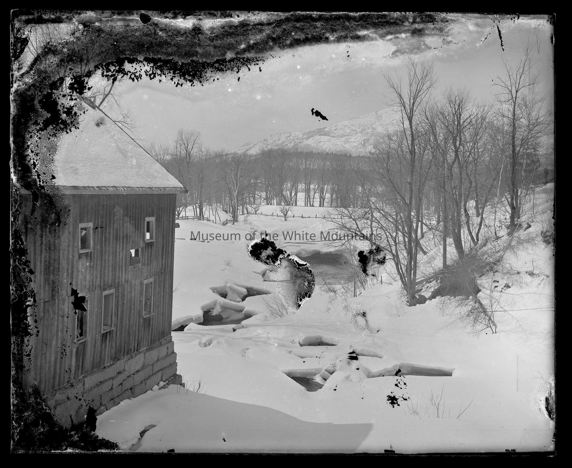 View of a depicts a farm in the winter time. There is a barn in the foreground, and a stream running through the image. There is a snow capped mountain in the background. .